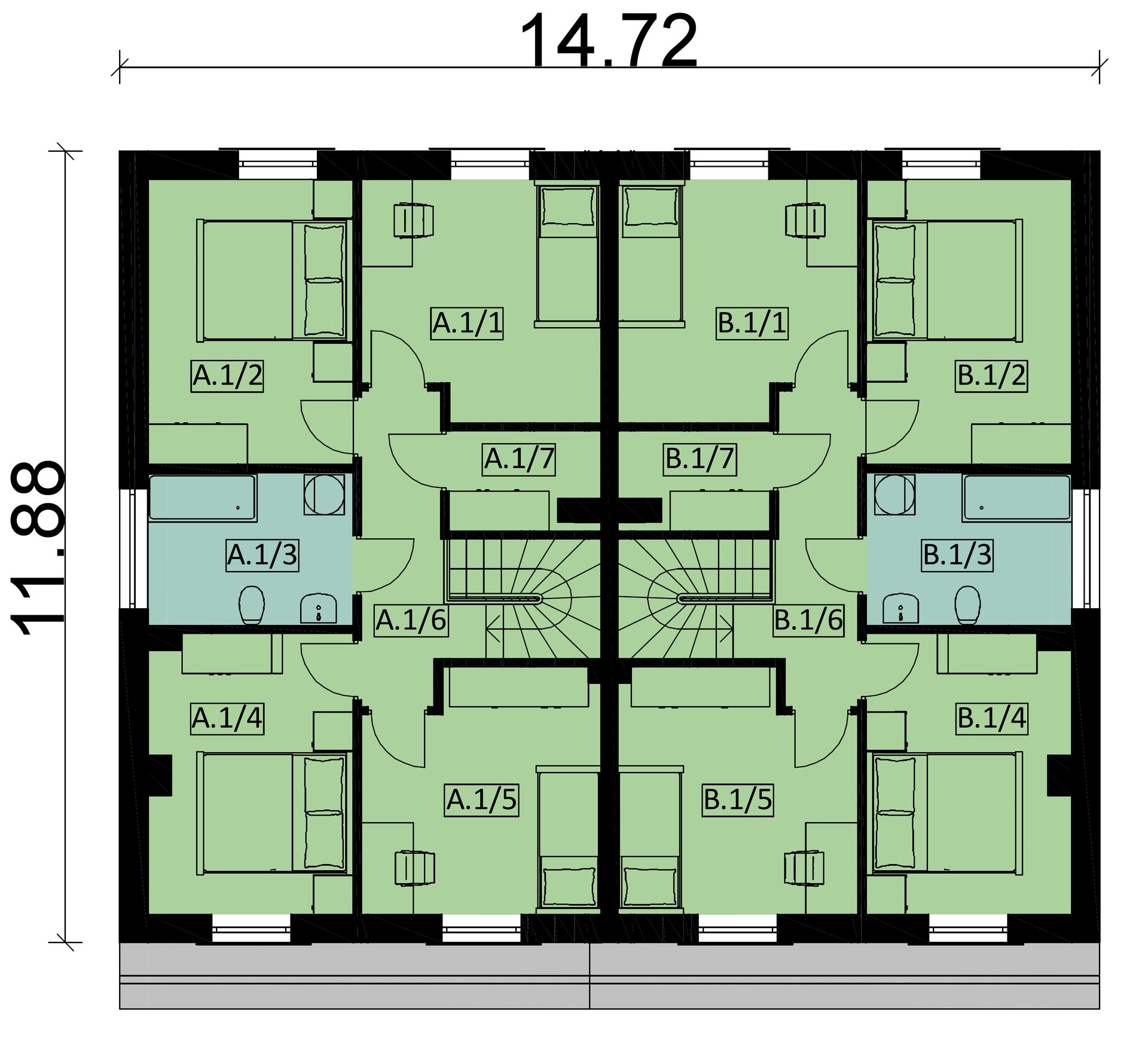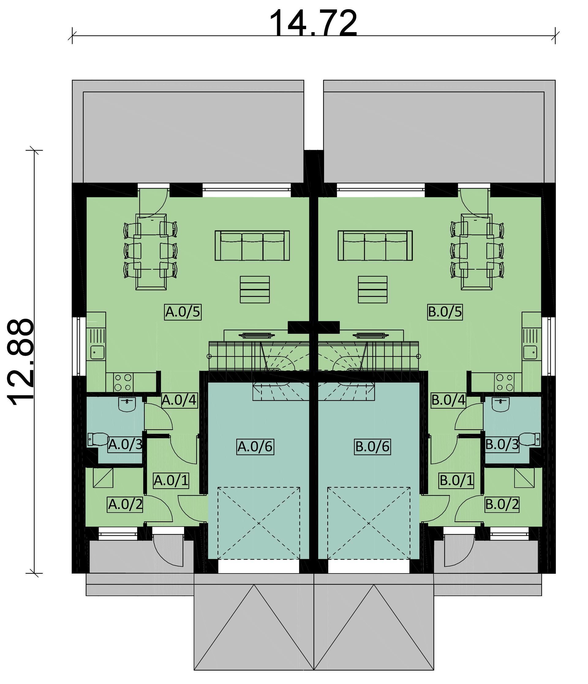 Projekt jest w fazie koncepcji. Przy zakupie projektu należy zapłacić 50% zaliczki. Zaliczka jest bezzwrotna w przypadku zwrotu lub rezygnacji z zamówienia. Dokumentacja zabezpieczona jest specjalną plombą, której usunięcie uniemożliwi jej zwrot oraz wymianę. Zapraszamy do zamówienia przed zakupem rysunków szczegółowych projektu oraz analizy posiadanej działki w celu upewnienia się, że wybrany projekt domu idealnie na nią pasuje. Projekt dostępny w konfiguracjach: bliźniak z segmentami lewym i prawym na osobnych dokumentacjach albo bliźniak na jednej dokumentacji albo jednorodzinny dwulokalowy albo w zabudowie szeregowej. Warianty: Projekt dostępny również w wersji szeregowej, złożonej z 3, 4, 5 albo 6 segmentów. W sprawie szczegółów zapraszamy do kontaktu!