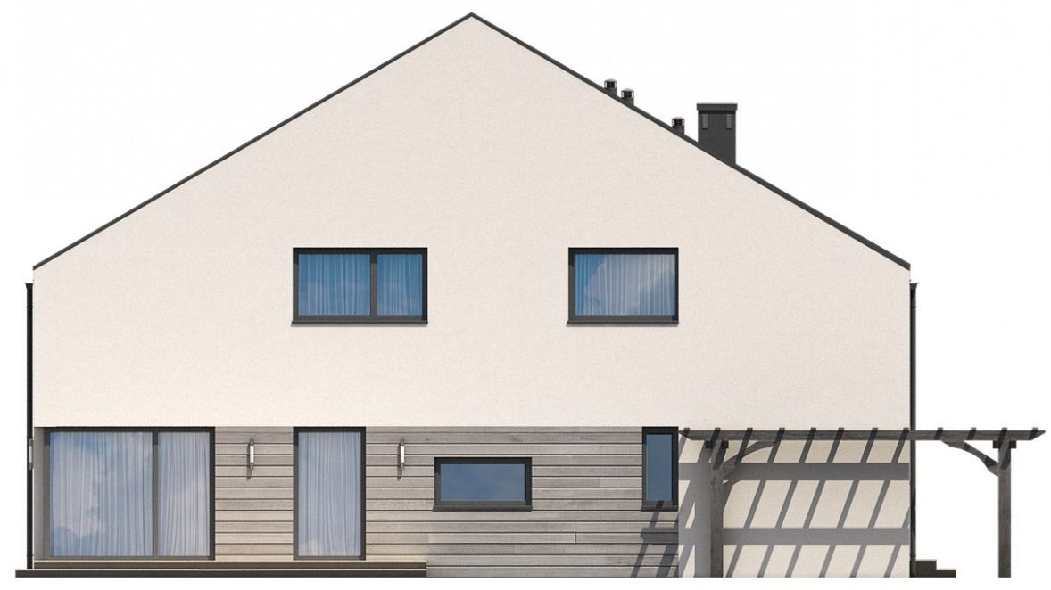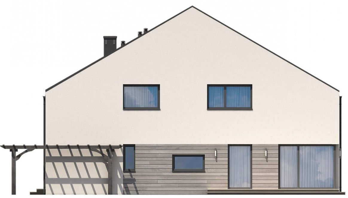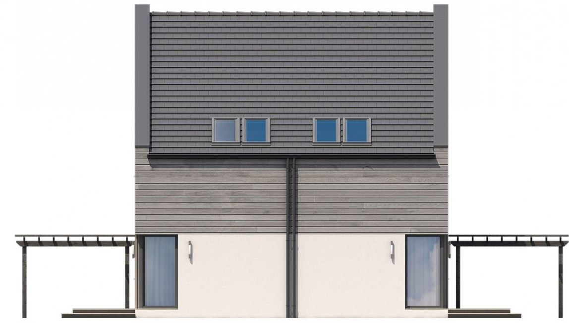 Graficzne opracowanie rzutów poglądowych widocznych na karcie projektu zostało wykonane przez Extradom.pl. Prezentowane przez Extradom.pl wizualizacje wykonane zostały przez autora projektu i należy poczytywać je jedynie za przykład i propozycję wykończenia, wizję architektoniczną autora projektu. Ostateczne wykończenie budynku może nastąpić na wiele sposobów. Szczegółowe rozwiązania zastosowane w oferowanej dokumentacji - w tym również ilość, lokalizacje i wygląd okien, drzwi, kominów - mogą w niewielkim stopniu różnić się od prezentowanej wizualizacji budynku.