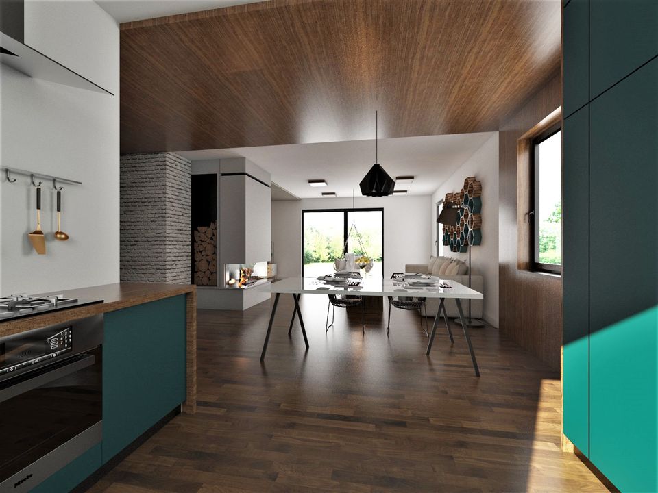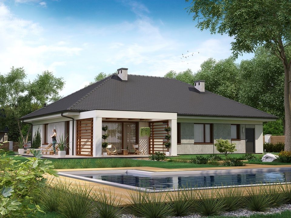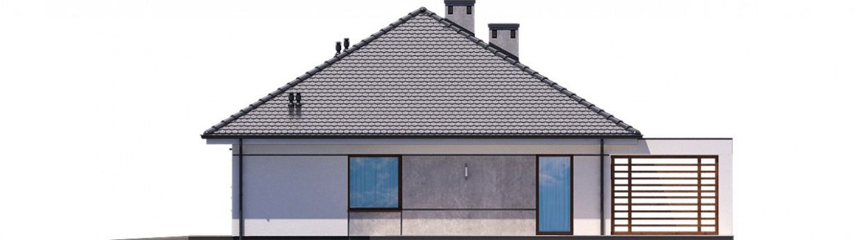 Graficzne opracowanie rzutów poglądowych widocznych na karcie projektu zostało wykonane przez Extradom.pl. Prezentowane przez Extradom.pl wizualizacje wykonane zostały przez autora projektu i należy poczytywać je jedynie za przykład i propozycję wykończenia, wizję architektoniczną autora projektu. Ostateczne wykończenie budynku może nastąpić na wiele sposobów. Szczegółowe rozwiązania zastosowane w oferowanej dokumentacji - w tym również ilość, lokalizacje i wygląd okien, drzwi, kominów - mogą w niewielkim stopniu różnić się od prezentowanej wizualizacji budynku.
