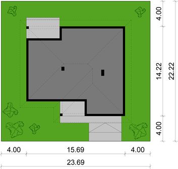 Graficzne opracowanie rzutów poglądowych widocznych na karcie projektu zostało wykonane przez Extradom.pl. Prezentowane przez Extradom.pl wizualizacje wykonane zostały przez autora projektu i należy poczytywać je jedynie za przykład i propozycję wykończenia, wizję architektoniczną autora projektu. Ostateczne wykończenie budynku może nastąpić na wiele sposobów. Szczegółowe rozwiązania zastosowane w oferowanej dokumentacji - w tym również ilość, lokalizacje i wygląd okien, drzwi, kominów - mogą w niewielkim stopniu różnić się od prezentowanej wizualizacji budynku.