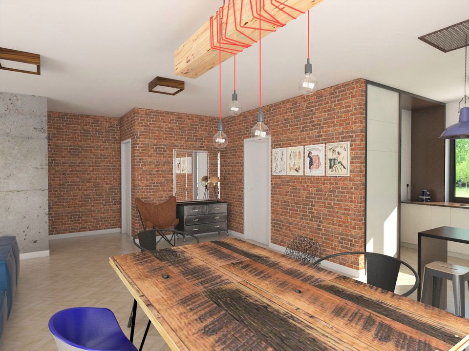 Graficzne opracowanie rzutów poglądowych widocznych na karcie projektu zostało wykonane przez Extradom.pl. Prezentowane przez Extradom.pl wizualizacje wykonane zostały przez autora projektu i należy poczytywać je jedynie za przykład i propozycję wykończenia, wizję architektoniczną autora projektu. Ostateczne wykończenie budynku może nastąpić na wiele sposobów. Szczegółowe rozwiązania zastosowane w oferowanej dokumentacji - w tym również ilość, lokalizacje i wygląd okien, drzwi, kominów - mogą w niewielkim stopniu różnić się od prezentowanej wizualizacji budynku.