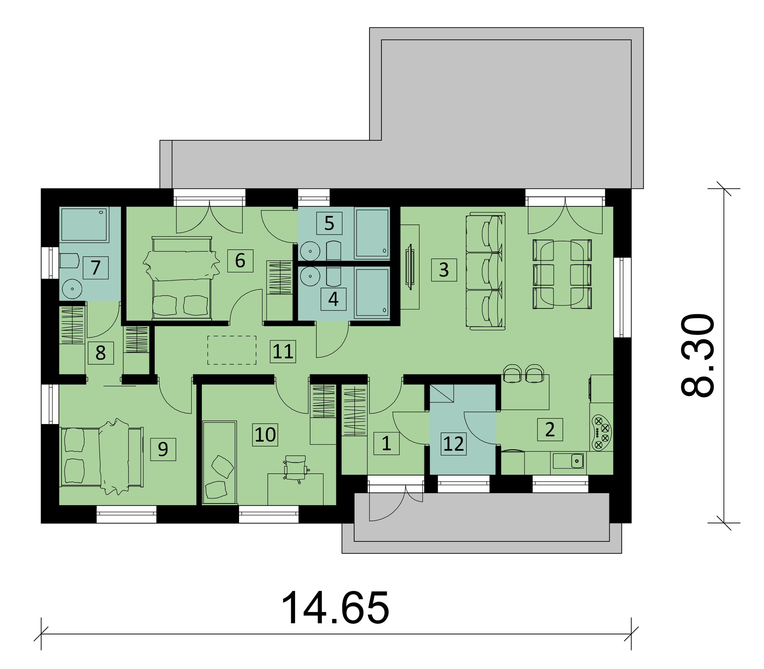 Graficzne opracowanie rzutów poglądowych widocznych na karcie projektu zostało wykonane przez Extradom.pl. Prezentowane przez Extradom.pl wizualizacje wykonane zostały przez autora projektu i należy poczytywać je jedynie za przykład i propozycję wykończenia, wizję architektoniczną autora projektu. Ostateczne wykończenie budynku może nastąpić na wiele sposobów. Szczegółowe rozwiązania zastosowane w oferowanej dokumentacji - w tym również ilość, lokalizacje i wygląd okien, drzwi, kominów - mogą w niewielkim stopniu różnić się od prezentowanej wizualizacji budynku.