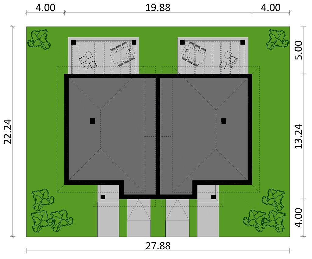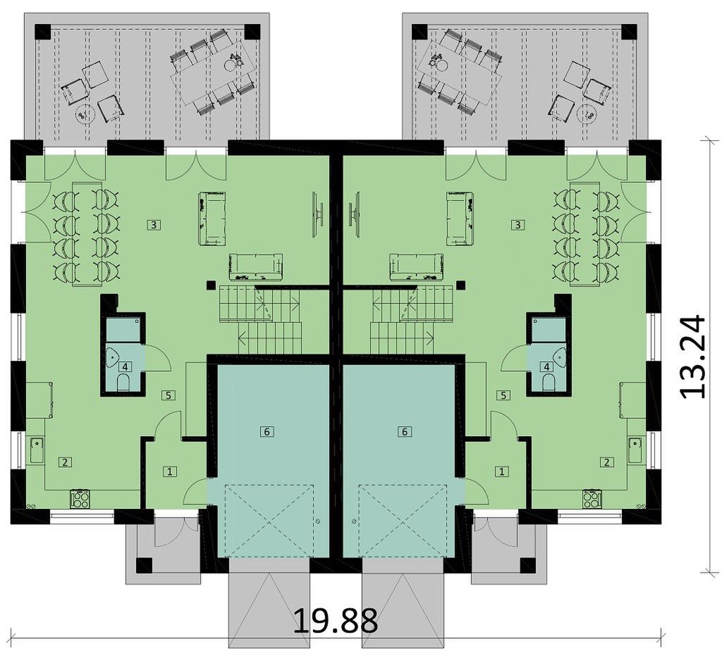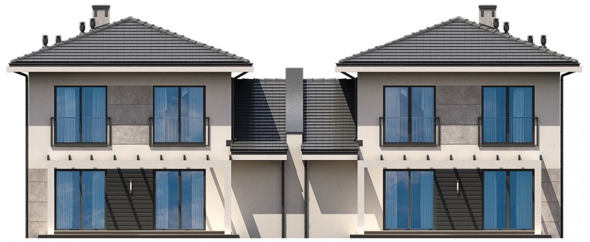 Projekt dostępny w konfiguracjach: bliźniak z segmentami lewym i prawym na osobnych dokumentacjach albo bliźniak na jednej dokumentacji albo jednorodzinny dwulokalowy. Dokumentacja zabezpieczona jest specjalną plombą, której usunięcie uniemożliwi jej zwrot oraz wymianę. Zapraszamy do zamówienia przed zakupem rysunków szczegółowych projektu oraz analizy posiadanej działki w celu upewnienia się, że wybrany projekt domu idealnie na nią pasuje.