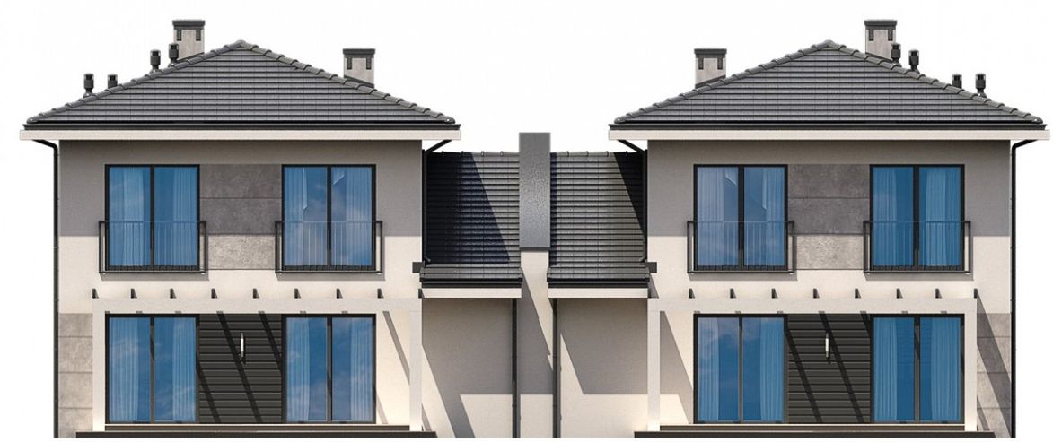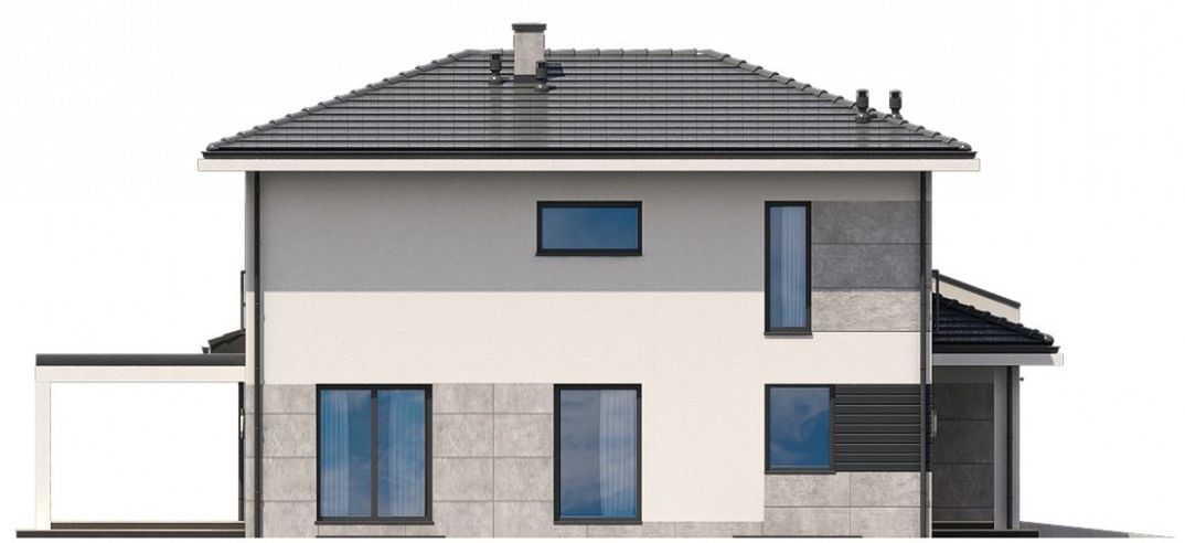 Graficzne opracowanie rzutów poglądowych widocznych na karcie projektu zostało wykonane przez Extradom.pl. Prezentowane przez Extradom.pl wizualizacje wykonane zostały przez autora projektu i należy poczytywać je jedynie za przykład i propozycję wykończenia, wizję architektoniczną autora projektu. Ostateczne wykończenie budynku może nastąpić na wiele sposobów. Szczegółowe rozwiązania zastosowane w oferowanej dokumentacji - w tym również ilość, lokalizacje i wygląd okien, drzwi, kominów - mogą w niewielkim stopniu różnić się od prezentowanej wizualizacji budynku.