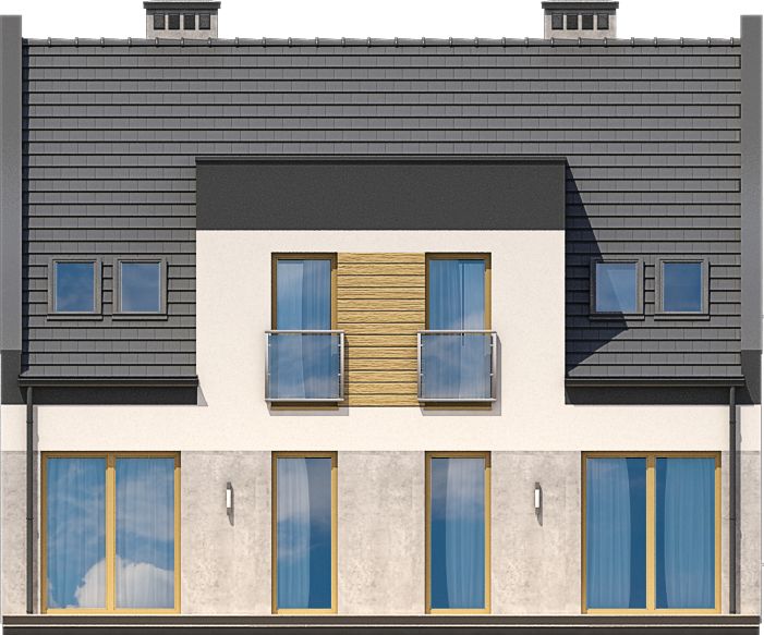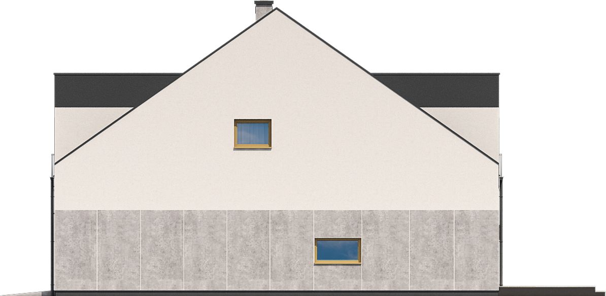 Graficzne opracowanie rzutów poglądowych widocznych na karcie projektu zostało wykonane przez Extradom.pl. Prezentowane przez Extradom.pl wizualizacje wykonane zostały przez autora projektu i należy poczytywać je jedynie za przykład i propozycję wykończenia, wizję architektoniczną autora projektu. Ostateczne wykończenie budynku może nastąpić na wiele sposobów. Szczegółowe rozwiązania zastosowane w oferowanej dokumentacji - w tym również ilość, lokalizacje i wygląd okien, drzwi, kominów - mogą w niewielkim stopniu różnić się od prezentowanej wizualizacji budynku.