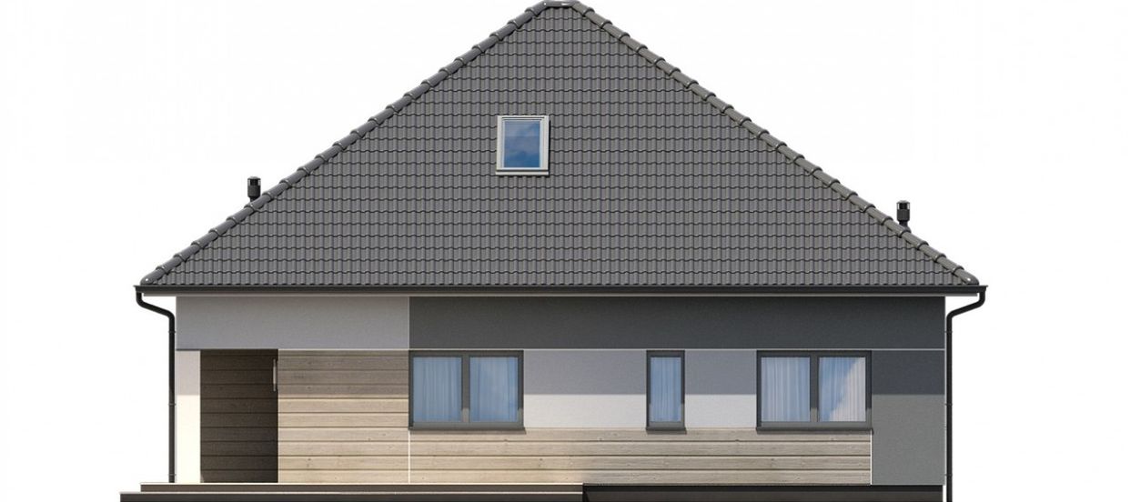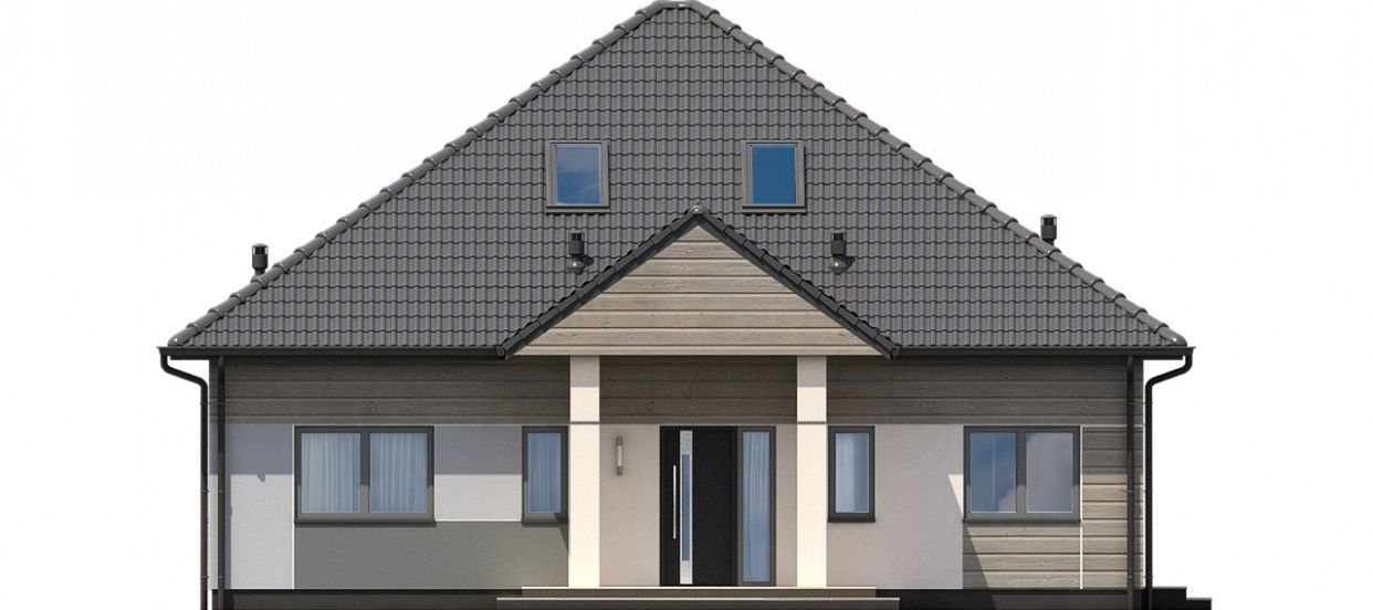 Graficzne opracowanie rzutów poglądowych widocznych na karcie projektu zostało wykonane przez Extradom.pl. Prezentowane przez Extradom.pl wizualizacje wykonane zostały przez autora projektu i należy poczytywać je jedynie za przykład i propozycję wykończenia, wizję architektoniczną autora projektu. Ostateczne wykończenie budynku może nastąpić na wiele sposobów. Szczegółowe rozwiązania zastosowane w oferowanej dokumentacji - w tym również ilość, lokalizacje i wygląd okien, drzwi, kominów - mogą w niewielkim stopniu różnić się od prezentowanej wizualizacji budynku.