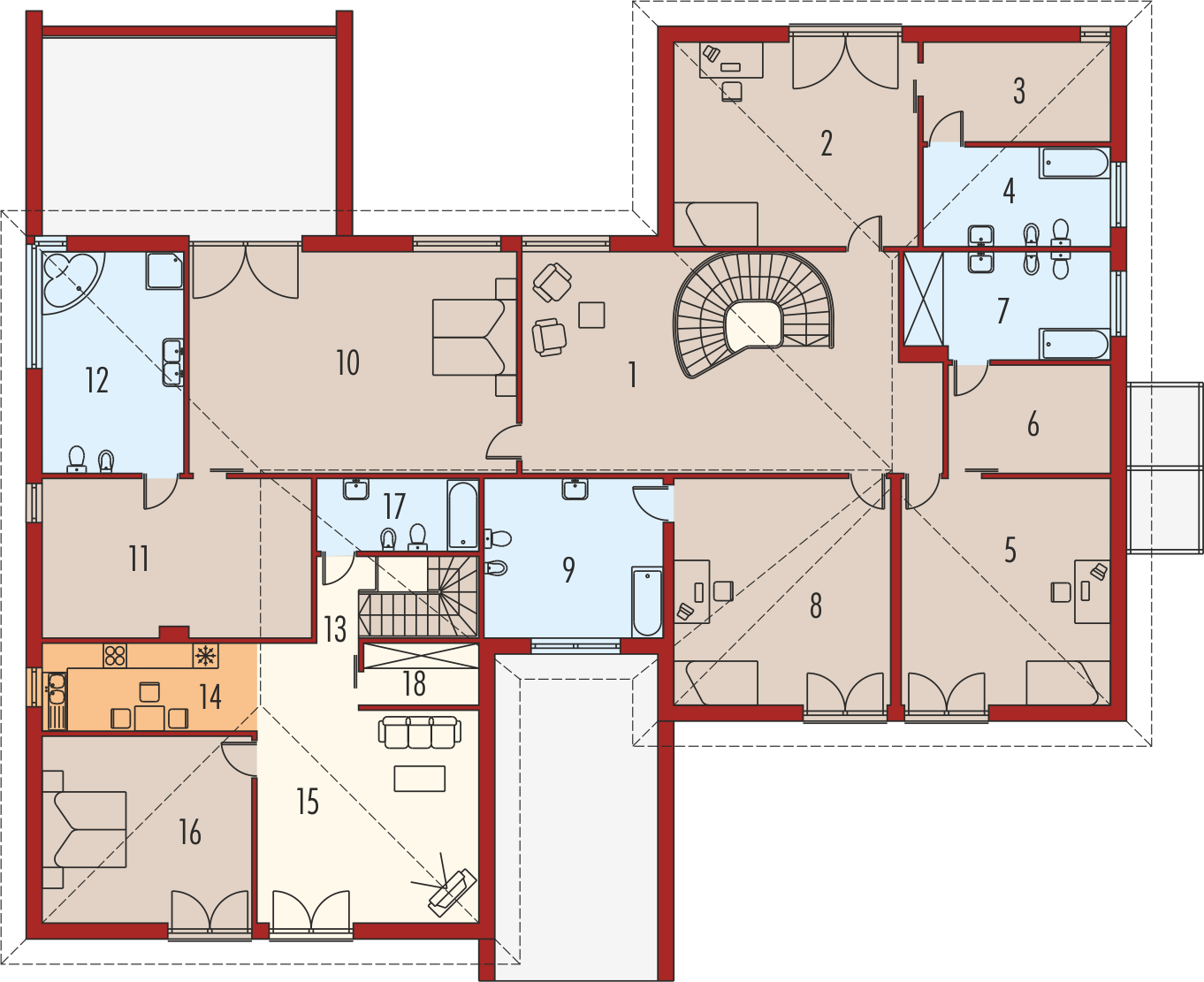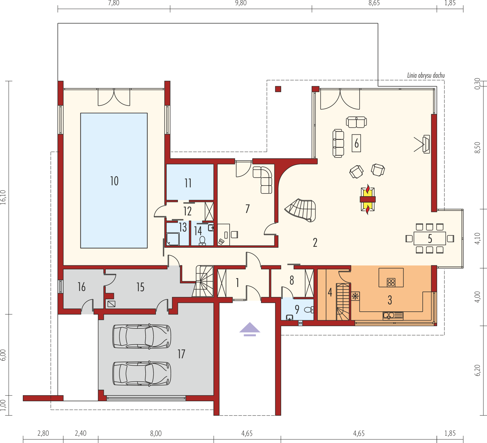 Graficzne opracowanie rzutów poglądowych widocznych na karcie projektu zostało wykonane przez Extradom.pl. Prezentowane przez Extradom.pl wizualizacje wykonane zostały przez autora projektu i należy poczytywać je jedynie za przykład i propozycję wykończenia, wizję architektoniczną autora projektu. Ostateczne wykończenie budynku może nastąpić na wiele sposobów. Szczegółowe rozwiązania zastosowane w oferowanej dokumentacji - w tym również ilość, lokalizacje i wygląd okien, drzwi, kominów - mogą w niewielkim stopniu różnić się od prezentowanej wizualizacji budynku.