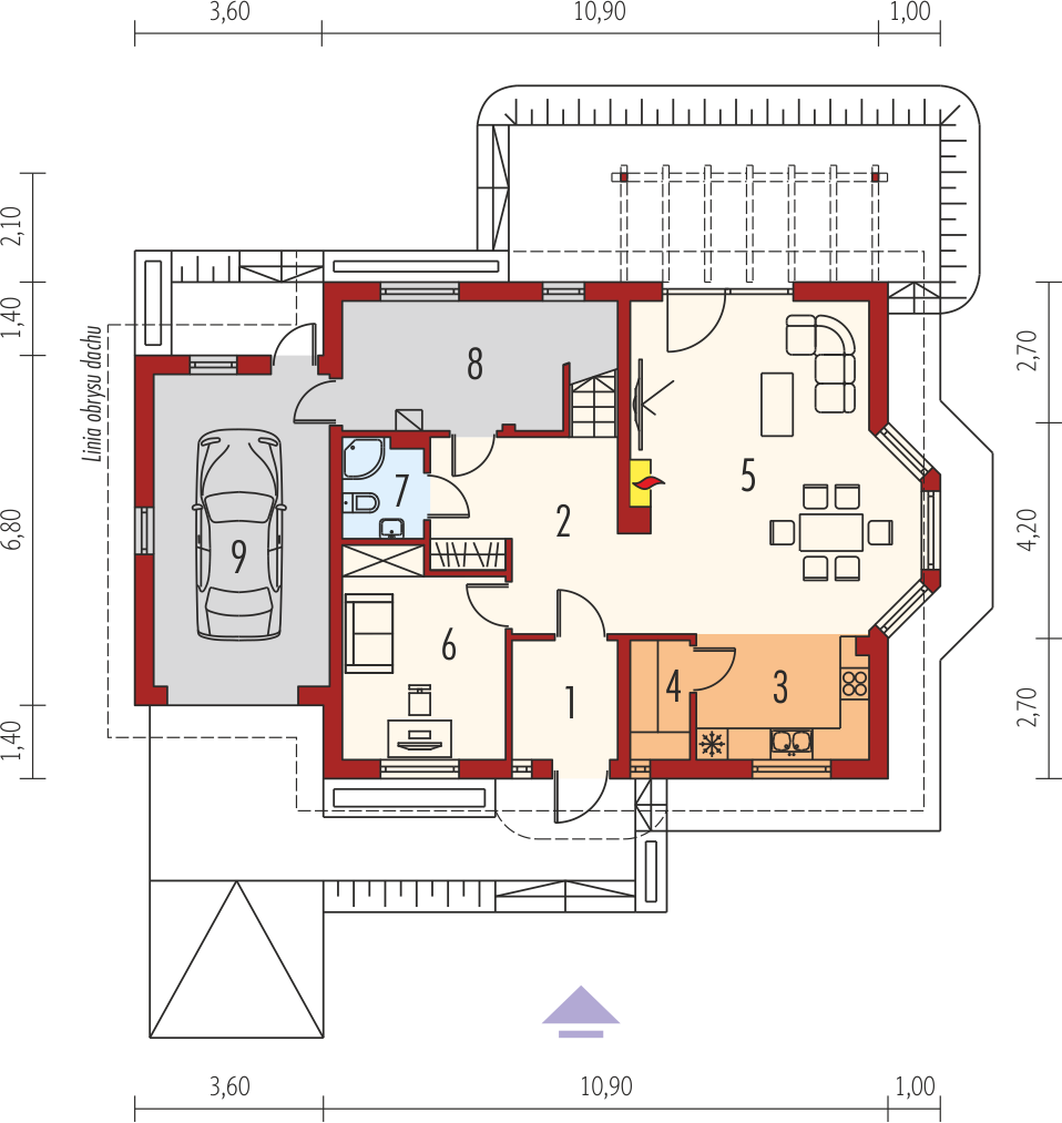 Graficzne opracowanie rzutów poglądowych widocznych na karcie projektu zostało wykonane przez Extradom.pl. Prezentowane przez Extradom.pl wizualizacje wykonane zostały przez autora projektu i należy poczytywać je jedynie za przykład i propozycję wykończenia, wizję architektoniczną autora projektu. Ostateczne wykończenie budynku może nastąpić na wiele sposobów. Szczegółowe rozwiązania zastosowane w oferowanej dokumentacji - w tym również ilość, lokalizacje i wygląd okien, drzwi, kominów - mogą w niewielkim stopniu różnić się od prezentowanej wizualizacji budynku.