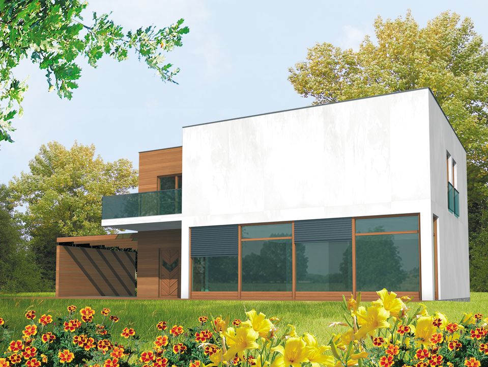 Technologia: -Dom zaprojektowano w technologii murowej ze stropami żelbetowymi. -Schody wewnętrzne drewniane. -Stropodach kryty folią termozgrzewalną.