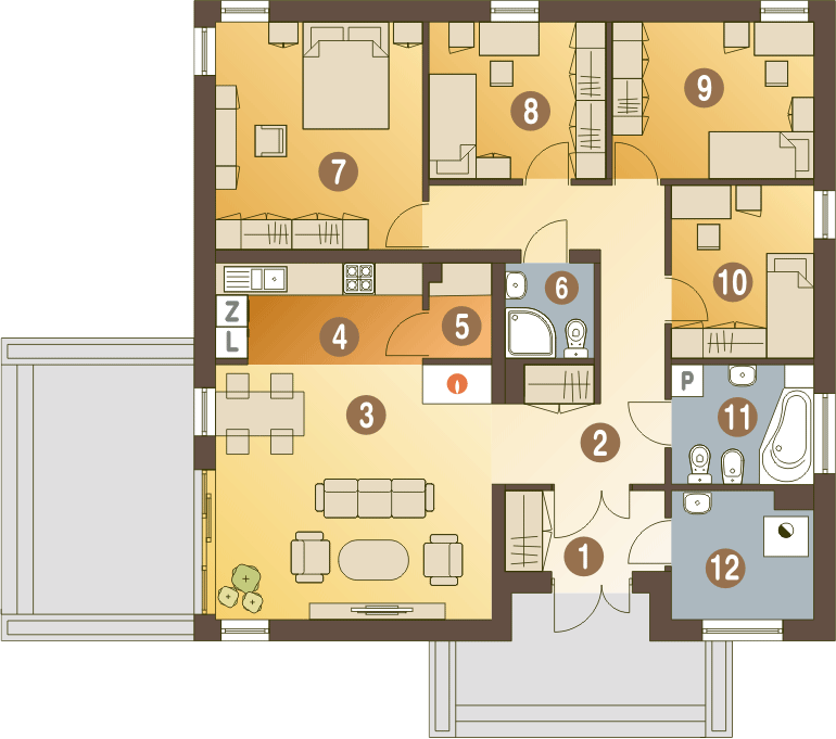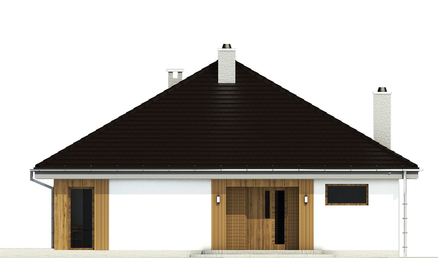Graficzne opracowanie rzutów poglądowych widocznych na karcie projektu zostało wykonane przez Extradom.pl. Prezentowane przez Extradom.pl wizualizacje wykonane zostały przez autora projektu i należy poczytywać je jedynie za przykład i propozycję wykończenia, wizję architektoniczną autora projektu. Ostateczne wykończenie budynku może nastąpić na wiele sposobów. Szczegółowe rozwiązania zastosowane w oferowanej dokumentacji - w tym również ilość, lokalizacje i wygląd okien, drzwi, kominów - mogą w niewielkim stopniu różnić się od prezentowanej wizualizacji budynku.