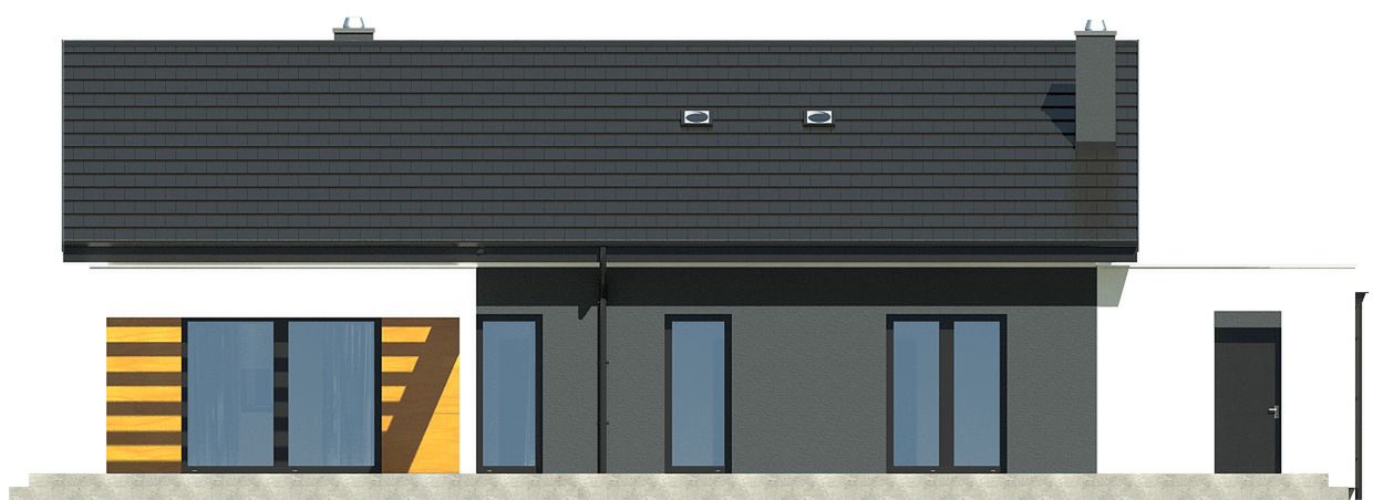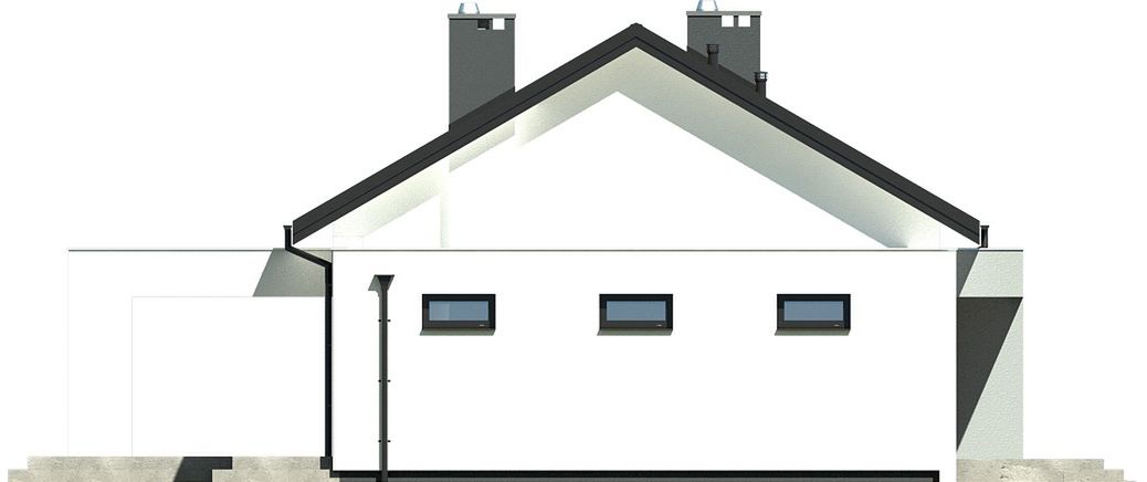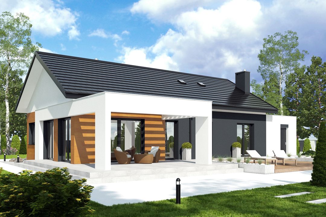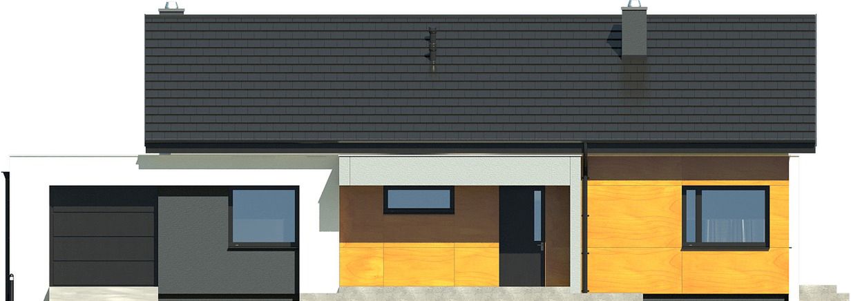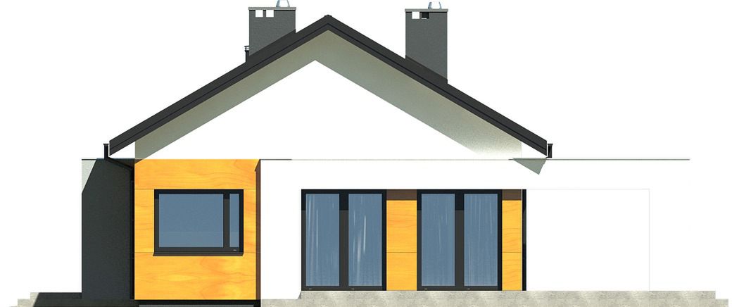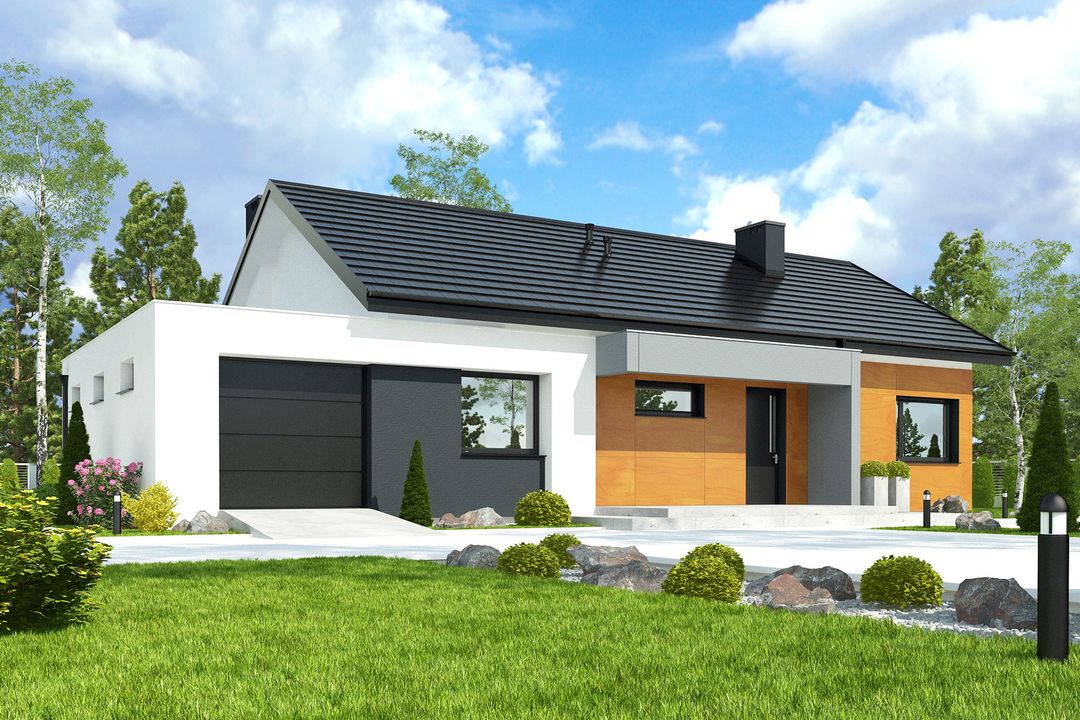 Prosta, zwarta bryła budynku została przykryta klasycznym dachem dwuspadowym, co stanowi połączenie nowoczesnego designu ze sprawdzonymi i ekonomicznymi rozwiązaniami konstrukcyjnymi. Nowoczesny charakter projektu podkreśla starannie skomponowana elewacja, a duże przeszklenia otwierają wnętrze na otaczający ogród i zapewniają doskonałe doświetlenie pomieszczeń. Garaż został harmonijnie wkomponowany w linię budynku, tworząc spójną i elegancką całość.