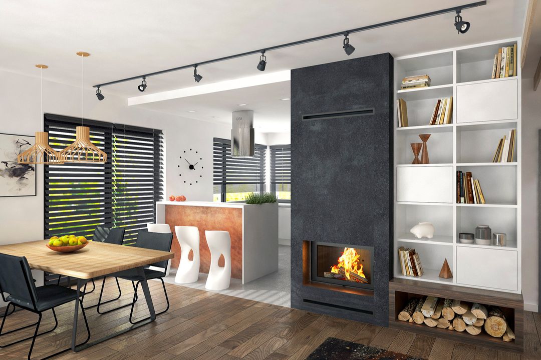 W sercu domu znajduje się przestronna, otwarta strefa dzienna, która łączy salon z kominkiem, jadalnię oraz kuchnię. To idealne miejsce do wspólnego spędzania czasu i przyjmowania gości. Komfort użytkowania kuchni podnosi przylegająca do niej spiżarnia, a duże przeszklenia w salonie otwierają dom na taras i ogród.