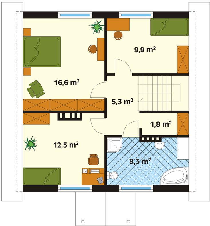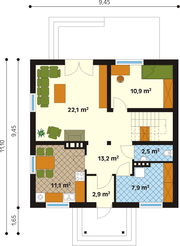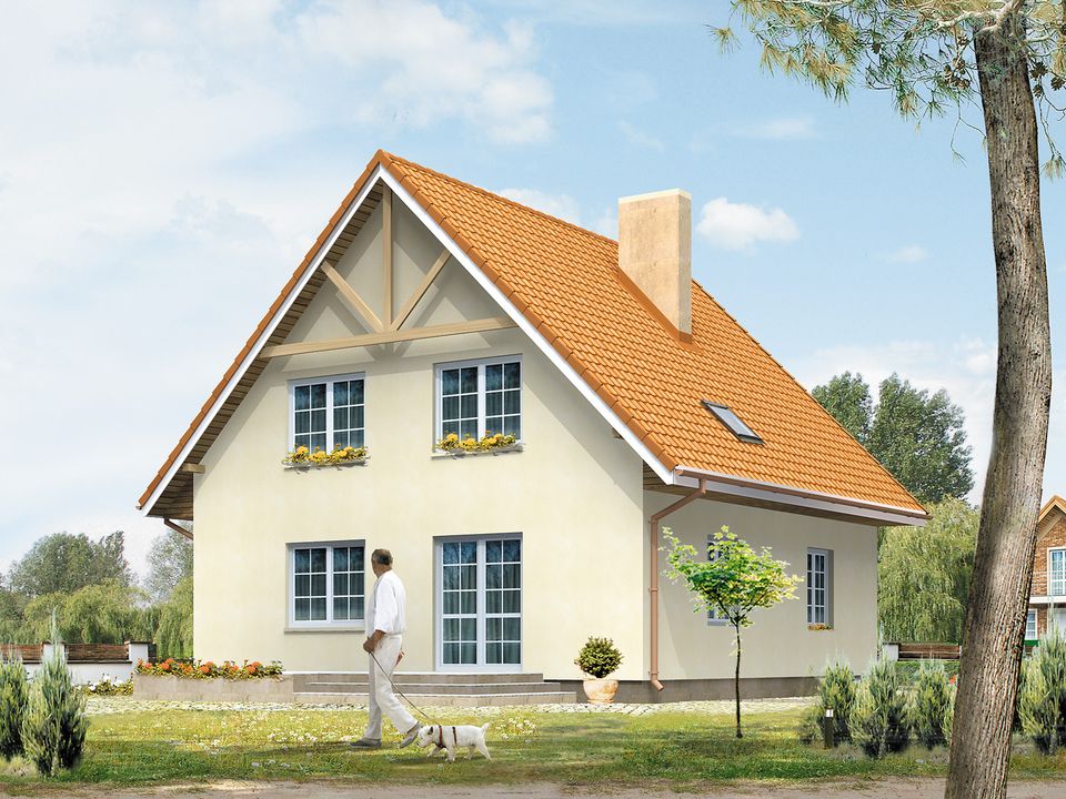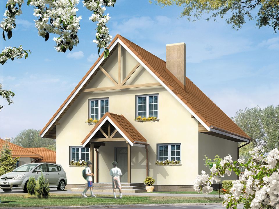Graficzne opracowanie rzutów poglądowych widocznych na karcie projektu zostało wykonane przez Extradom.pl. Prezentowane przez Extradom.pl wizualizacje wykonane zostały przez autora projektu i należy poczytywać je jedynie za przykład i propozycję wykończenia, wizję architektoniczną autora projektu. Ostateczne wykończenie budynku może nastąpić na wiele sposobów. Szczegółowe rozwiązania zastosowane w oferowanej dokumentacji - w tym również ilość, lokalizacje i wygląd okien, drzwi, kominów - mogą w niewielkim stopniu różnić się od prezentowanej wizualizacji budynku.