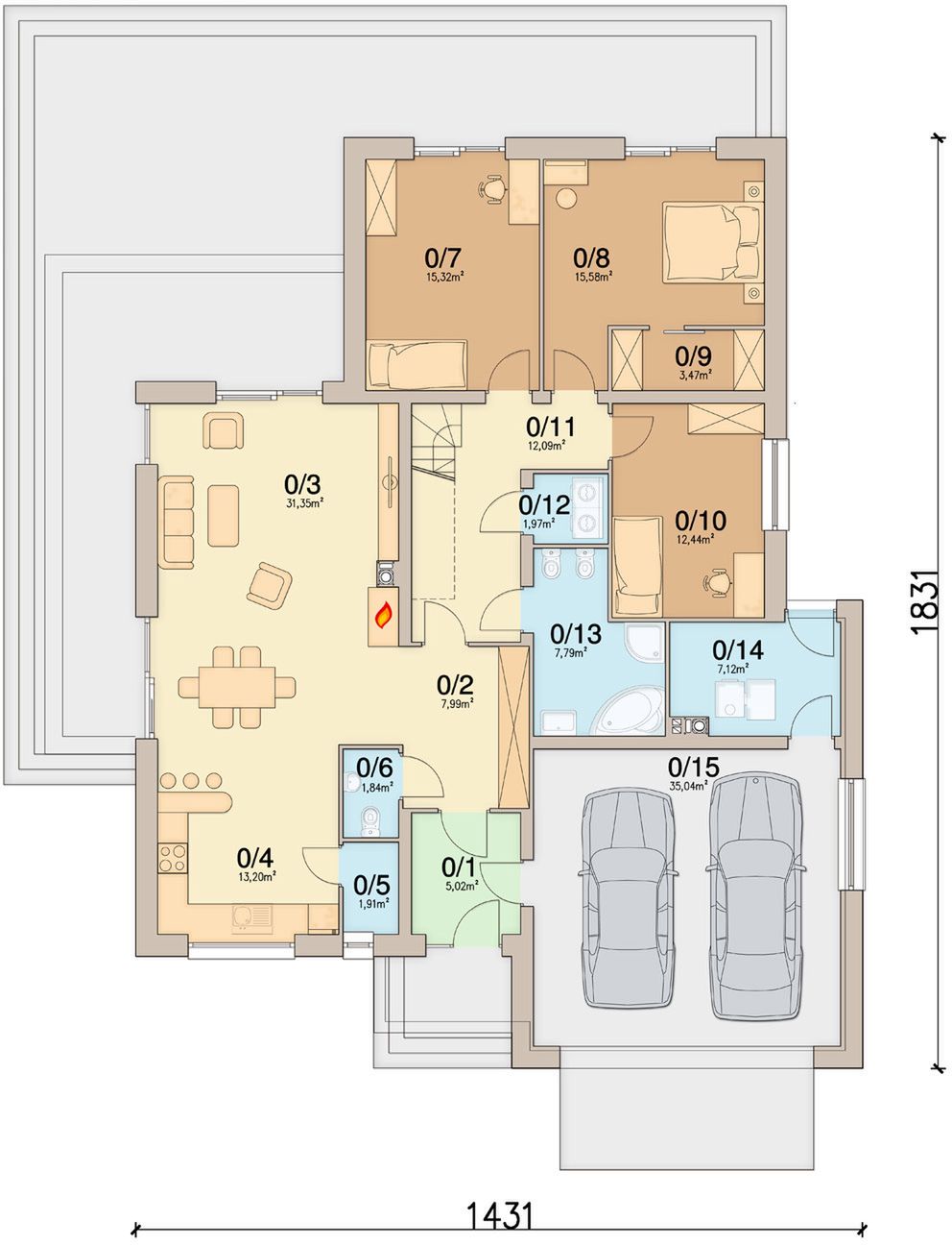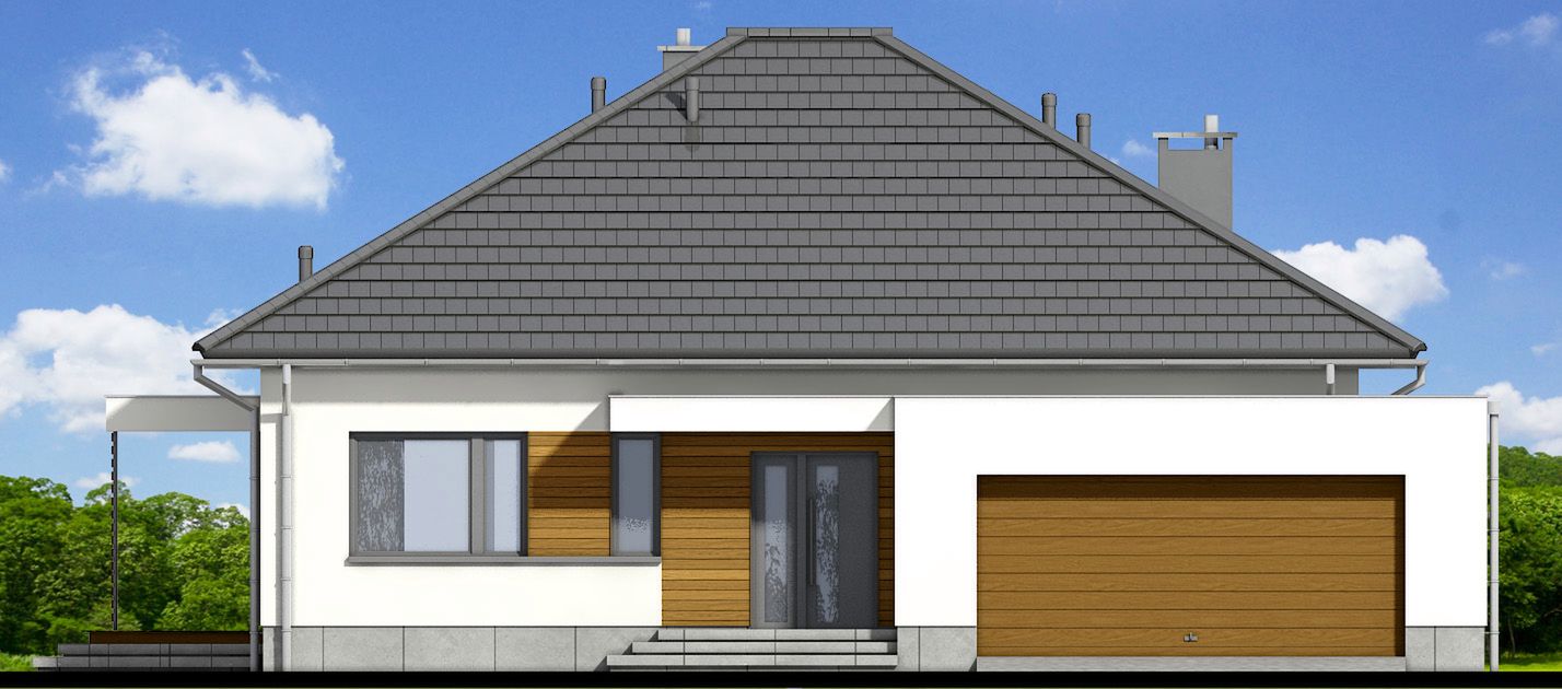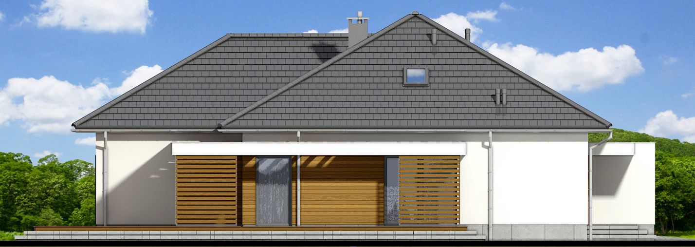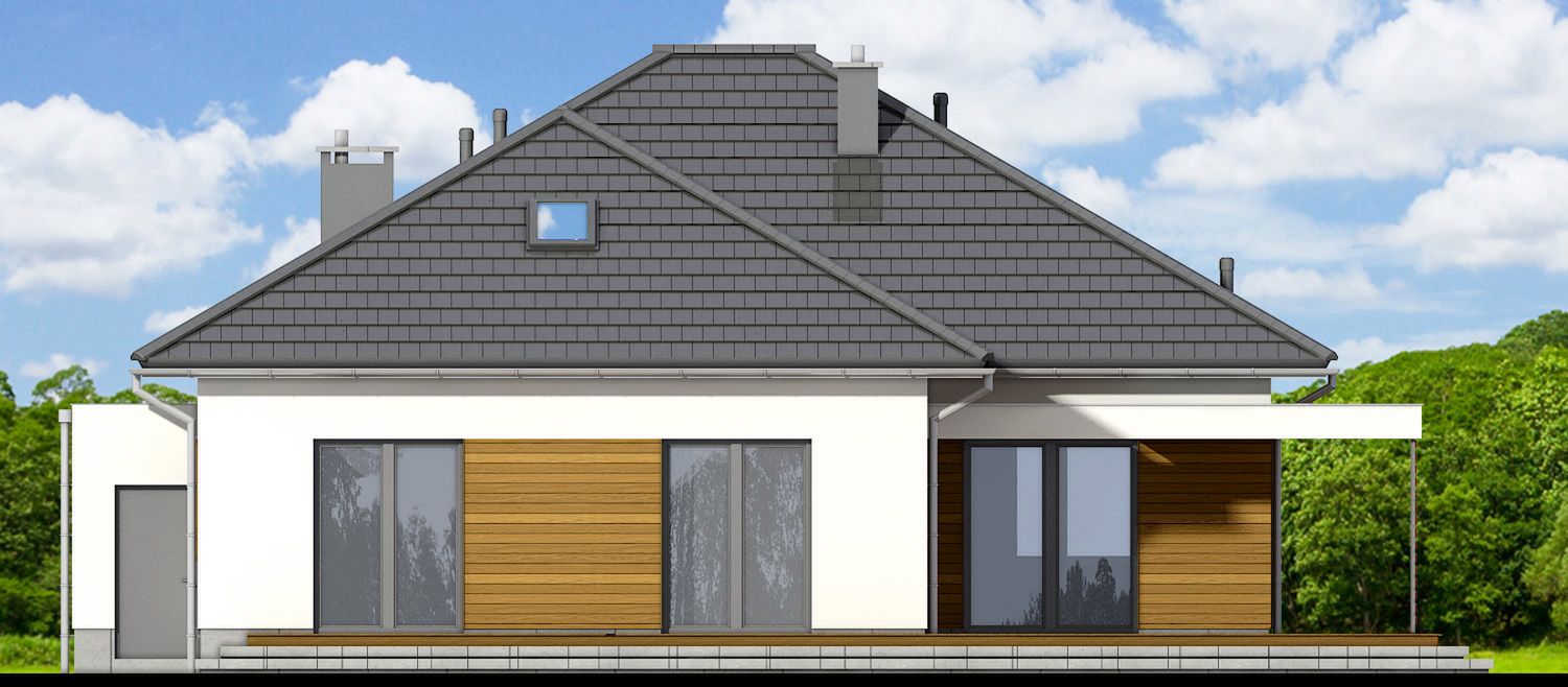 Graficzne opracowanie rzutów poglądowych widocznych na karcie projektu zostało wykonane przez Extradom.pl. Prezentowane przez Extradom.pl wizualizacje wykonane zostały przez autora projektu i należy poczytywać je jedynie za przykład i propozycję wykończenia, wizję architektoniczną autora projektu. Ostateczne wykończenie budynku może nastąpić na wiele sposobów. Szczegółowe rozwiązania zastosowane w oferowanej dokumentacji - w tym również ilość, lokalizacje i wygląd okien, drzwi, kominów - mogą w niewielkim stopniu różnić się od prezentowanej wizualizacji budynku.