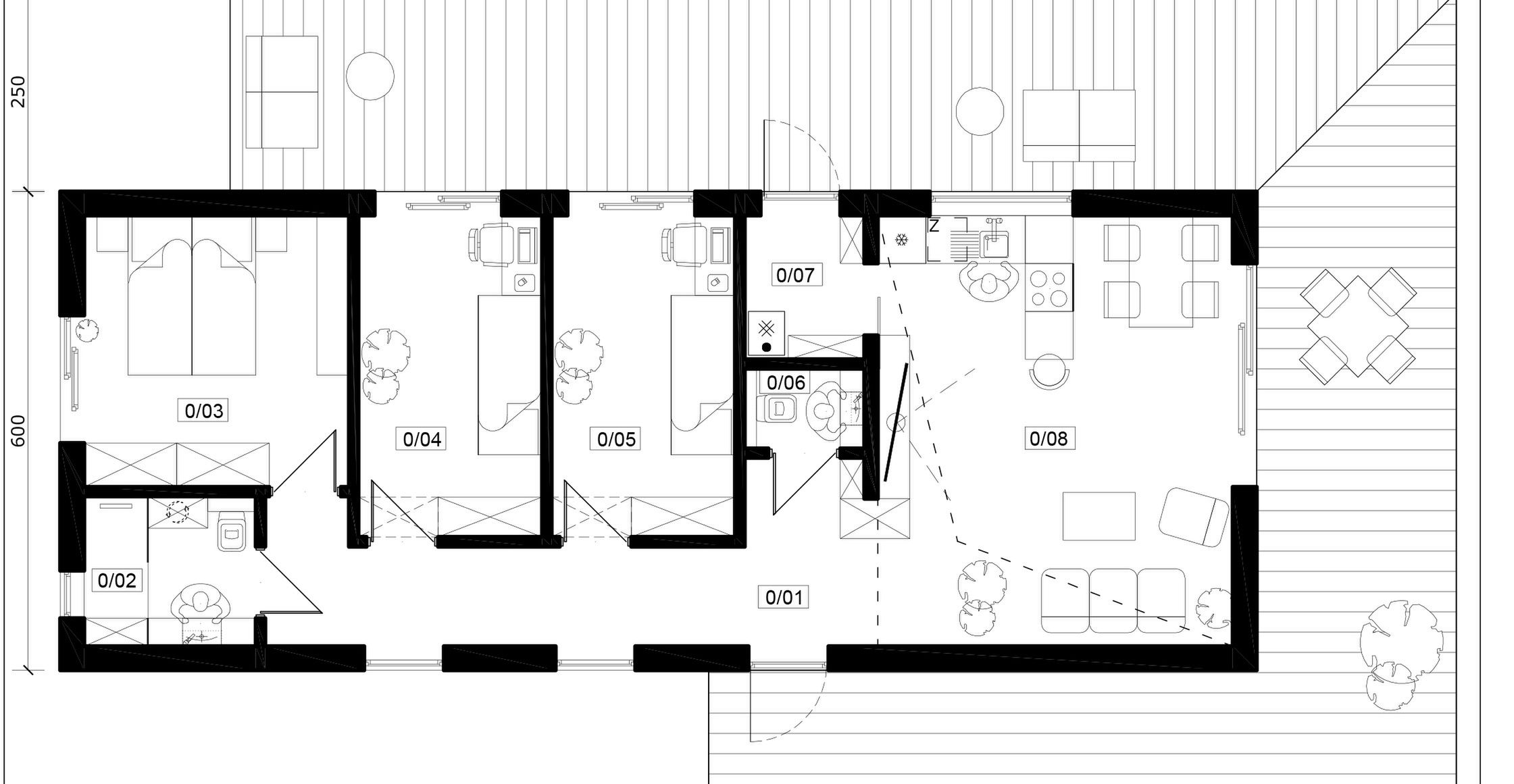 fundamenty: płyta żelbetowa; ściany zewnętrzne: ściana szkieletowa 30cm; ściany wewnętrzne: ściana szkieletowa 17cm; 12 cm; strop: drewniany; konstrukcja i pokrycie dachu: drewniana jętkowa, blacha; elewacja: deska, tynk;