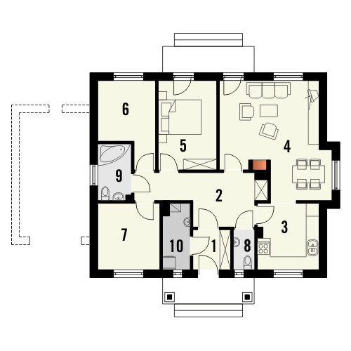 Graficzne opracowanie rzutów poglądowych widocznych na karcie projektu zostało wykonane przez Extradom.pl. Prezentowane przez Extradom.pl wizualizacje wykonane zostały przez autora projektu i należy poczytywać je jedynie za przykład i propozycję wykończenia, wizję architektoniczną autora projektu. Ostateczne wykończenie budynku może nastąpić na wiele sposobów. Szczegółowe rozwiązania zastosowane w oferowanej dokumentacji - w tym również ilość, lokalizacje i wygląd okien, drzwi, kominów - mogą w niewielkim stopniu różnić się od prezentowanej wizualizacji budynku.