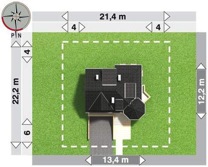 Graficzne opracowanie rzutów poglądowych widocznych na karcie projektu zostało wykonane przez Extradom.pl. Prezentowane przez Extradom.pl wizualizacje wykonane zostały przez autora projektu i należy poczytywać je jedynie za przykład i propozycję wykończenia, wizję architektoniczną autora projektu. Ostateczne wykończenie budynku może nastąpić na wiele sposobów. Szczegółowe rozwiązania zastosowane w oferowanej dokumentacji - w tym również ilość, lokalizacje i wygląd okien, drzwi, kominów - mogą w niewielkim stopniu różnić się od prezentowanej wizualizacji budynku.