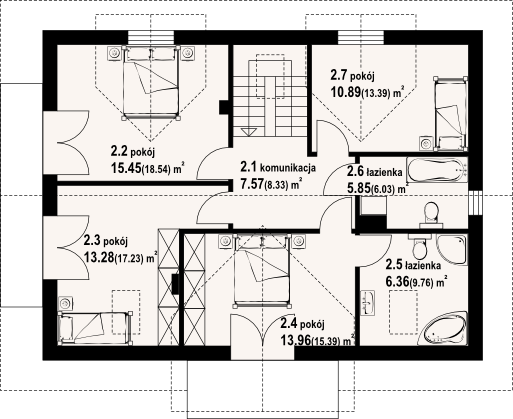 Wysokość ścianki kolankowej: 0.86 m. Strop: płyta żelbetowa. Pokrycie dachu: dachówka ceramiczna Koramic. Ściany zewnętrzne: pustaki ceramiczne Porotherm + styropian. Ściany wewnętrzne: pustaki ceramiczne Porotherm. Typ ogrzewania: kocioł gazowy. Inne: okna połaciowe Fakro.