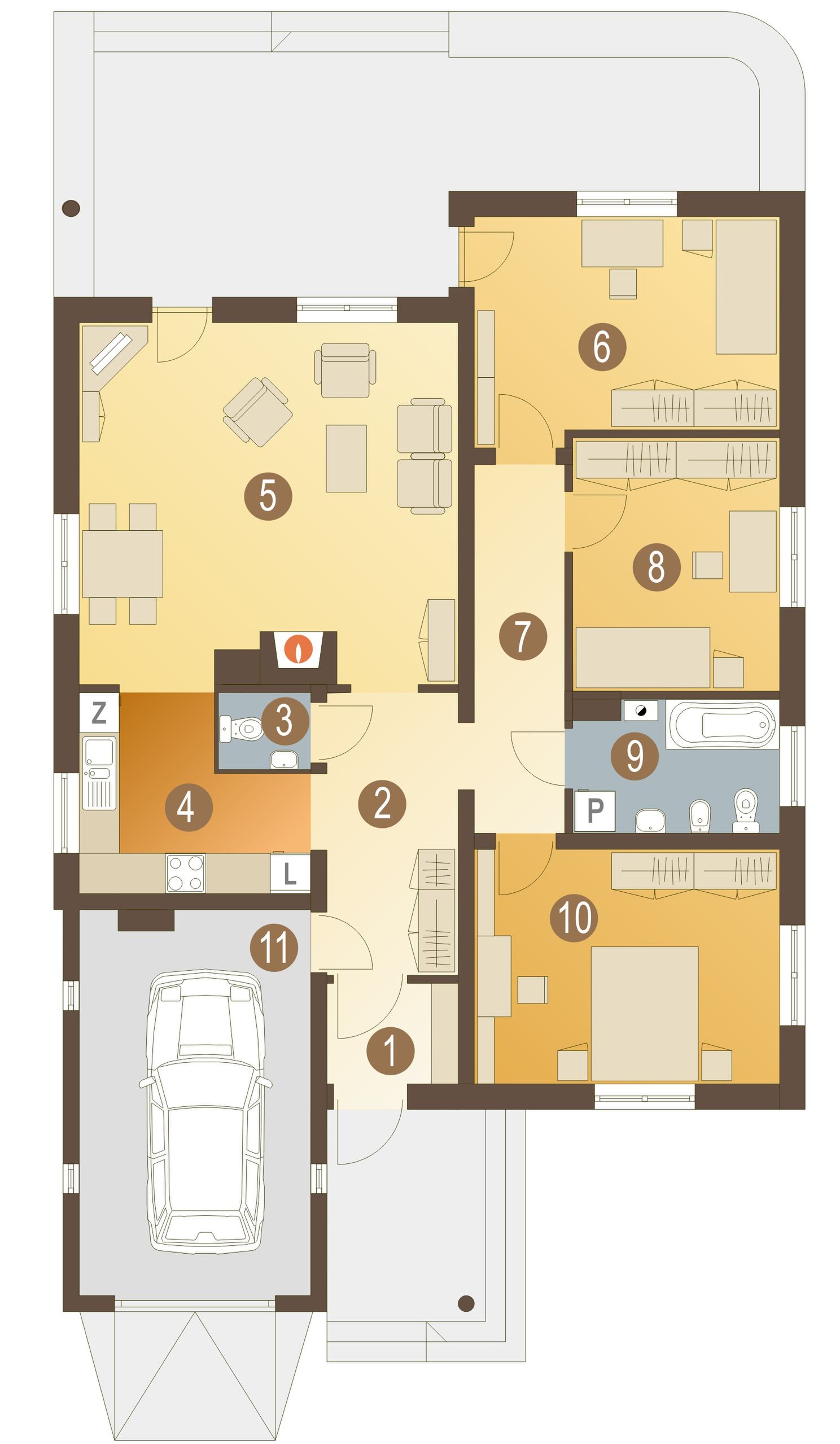 Projekt Kasia z garażem 1-st. WRF1095 odpowiadał nam pod wszystkimi względami, dlatego też zdecydowaliśmy się na jego realizację. Od początku zależało nam na domu parterowym, którego budowa nie pochłonie zbyt wielu środków finansowych. Dodatkowo, przewidziany w nim układ pomieszczeń bardzo nam się spodobał ze względu na swoją funkcjonalność.Nasz dom budowałem własnymi siłami. Mam doświadczenie w tym temacie i nie sprawiło mi to żadnych trudności. Projekt był dobrze dopracowany, nie zauważyłem w nim żadnych niedociągnięć i nie mam do niego zastrzeżeń. Realizacja w naszym przypadku była podzielona na trzy etapy. W pierwszym roku odbyły się prace fundamentowe, w drugim stawialiśmy mury, a w następnym wykonaliśmy więźbę i pokryliśmy dach.Do postawienia ścian użyłem ceramicznych pustaków Porotherm 25 cm, a bryłę z zewnątrz postanowiłem ocieplić 15 cm warstwą styropianu. Myślę, że koszty tej inwestycji można sklasyfikować jako umiarkowane. Duży wpływ na cenę inwestycji ma z pewnością rodzaj materiału użytego do pokrycia dachu. Stan zero: wykopy mapki, pozwolenia, bloczki m-6, zbrojenia, ława fundamentowa, izolacja, beton z pompą to koszt ok. 20 tyś zł Bloczki Porotherm, kominy,podciągi, zbrojenia kształtki, wieniec - ok. 26 tyś. Więźba,dachówka ceramiczna Koramic, podciągi HEB oraz robocizna dekarza i cieśli wyniosły nas ok. 60 tyś. Okna z Roletami firmy Aluplast, drzwi zewnętrzne drewniane - 17,5 tyś. Stan surowy zamknięty oceniam na kwotę około 120 tys. zł. bez kosztów robocizny murarza, której orientacyjna cena to 30 tyś zł (w zależności od województwa).Do projektu domu parterowego Kasia z garażem 1-st. WRF1095 nanieśliśmy kilka niewielkich zmian. Drobne modyfikacje zastosowaliśmy odnośnie podciągów HEB nad garażem, a także zrezygnowaliśmy z komina w centralnej części domu przewidzianego na zrobienie kominka. Sypialnia od strony tarasu jest nieco wysunięta i w przy naszym usytuowaniu domu znajduje się blisko granicy działki. Aby zachować przepisową odległość od terenu sąsiada, musieliśmy przenieść okno w tym miejscu, na prostopadłą ścianę pokoju.Jestem zadowolony z wyboru projektu Kasia z garażem 1-st. WRF1095. Uwzględniony w nim układ pomieszczeń jest bardzo funkcjonalny i w całości spełnia moje oczekiwania. Został dobrze zaplanowany i nie ma potrzeby, aby go modyfikować. Salon jest naprawdę spory - uważam, że bez najmniejszych problemów można zorganizować w nim przyjęcie i zaprosić większą ilość gości. Liczba sypialni pozwala na pełny komfort użytkowania domu dla 4-osobowej rodziny, gdyż przy tym układzie rodzice oraz każde z dzieci ma swój własny pokój. Dużym plusem jest to, iż wszystkie pomieszczenia znajdują się na jednej kondygnacji i tym samym nie ma potrzeby wchodzenia po schodach. Pozdrawiam.