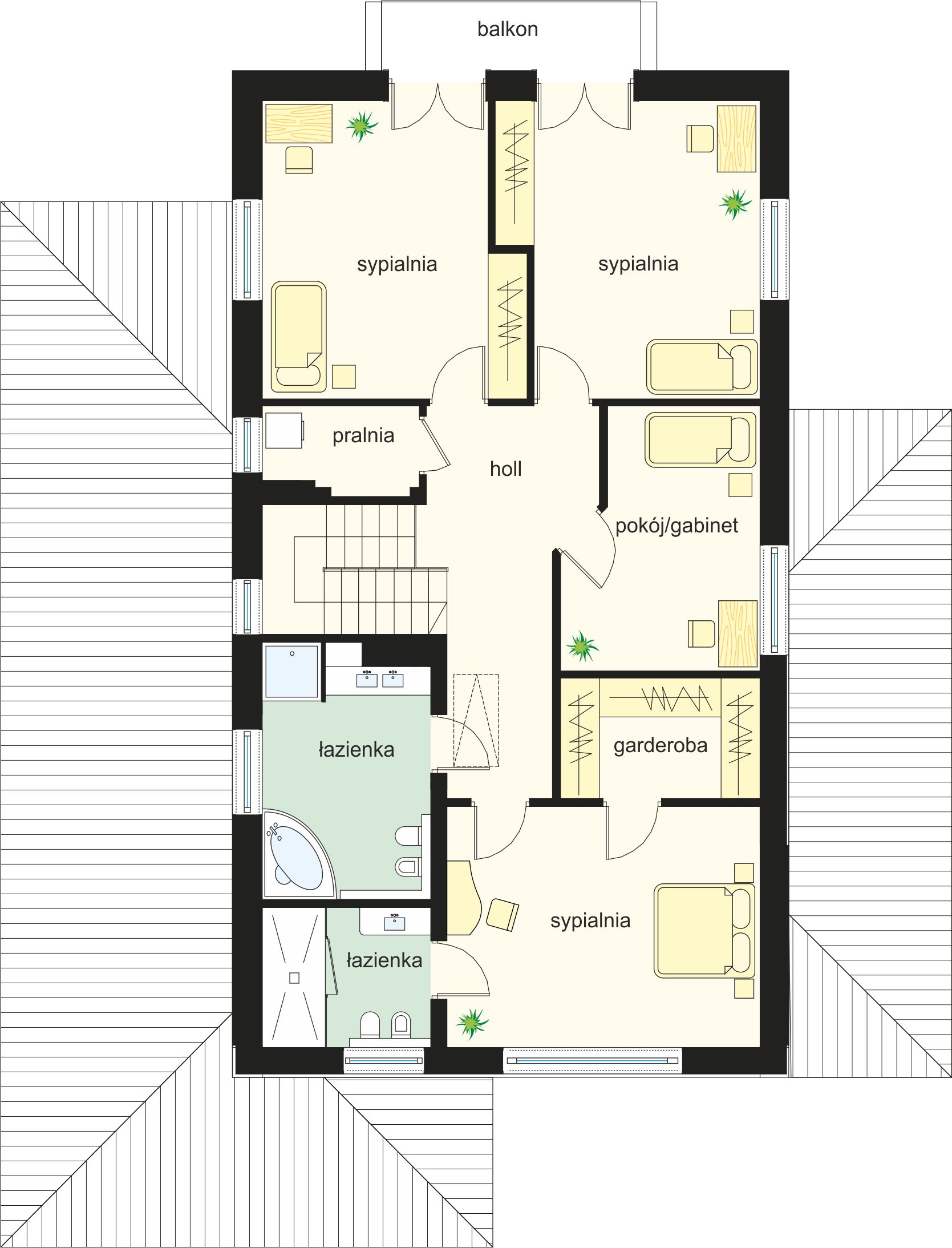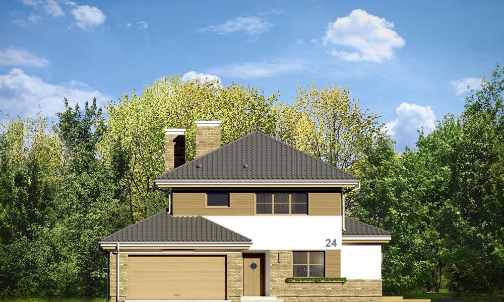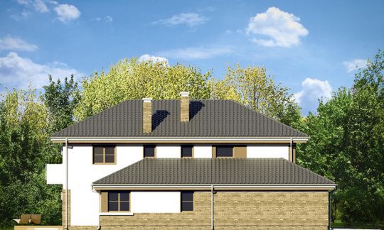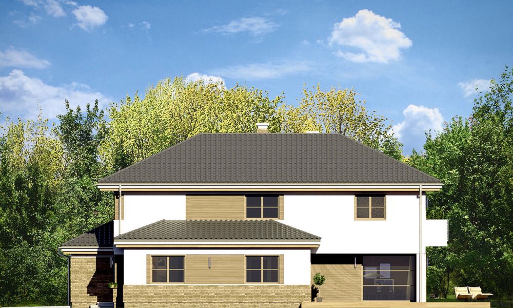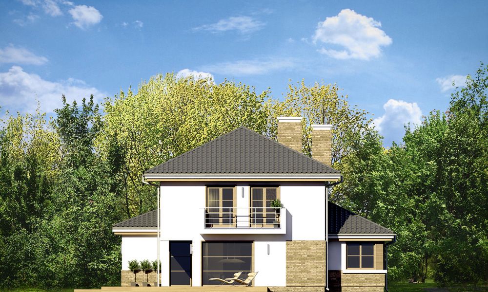 Graficzne opracowanie rzutów poglądowych widocznych na karcie projektu zostało wykonane przez Extradom.pl. Prezentowane przez Extradom.pl wizualizacje wykonane zostały przez autora projektu i należy poczytywać je jedynie za przykład i propozycję wykończenia, wizję architektoniczną autora projektu. Ostateczne wykończenie budynku może nastąpić na wiele sposobów. Szczegółowe rozwiązania zastosowane w oferowanej dokumentacji - w tym również ilość, lokalizacje i wygląd okien, drzwi, kominów - mogą w niewielkim stopniu różnić się od prezentowanej wizualizacji budynku.