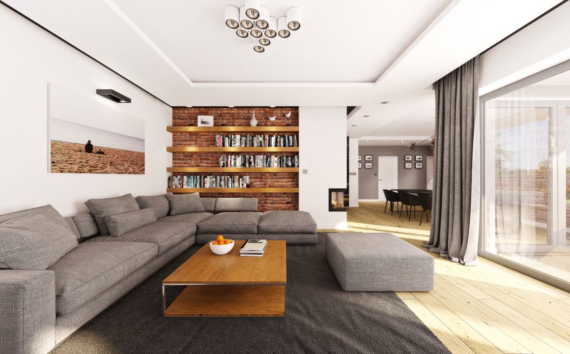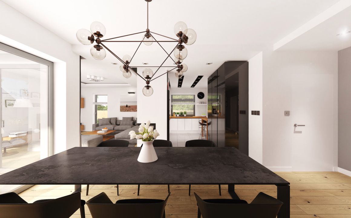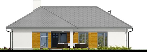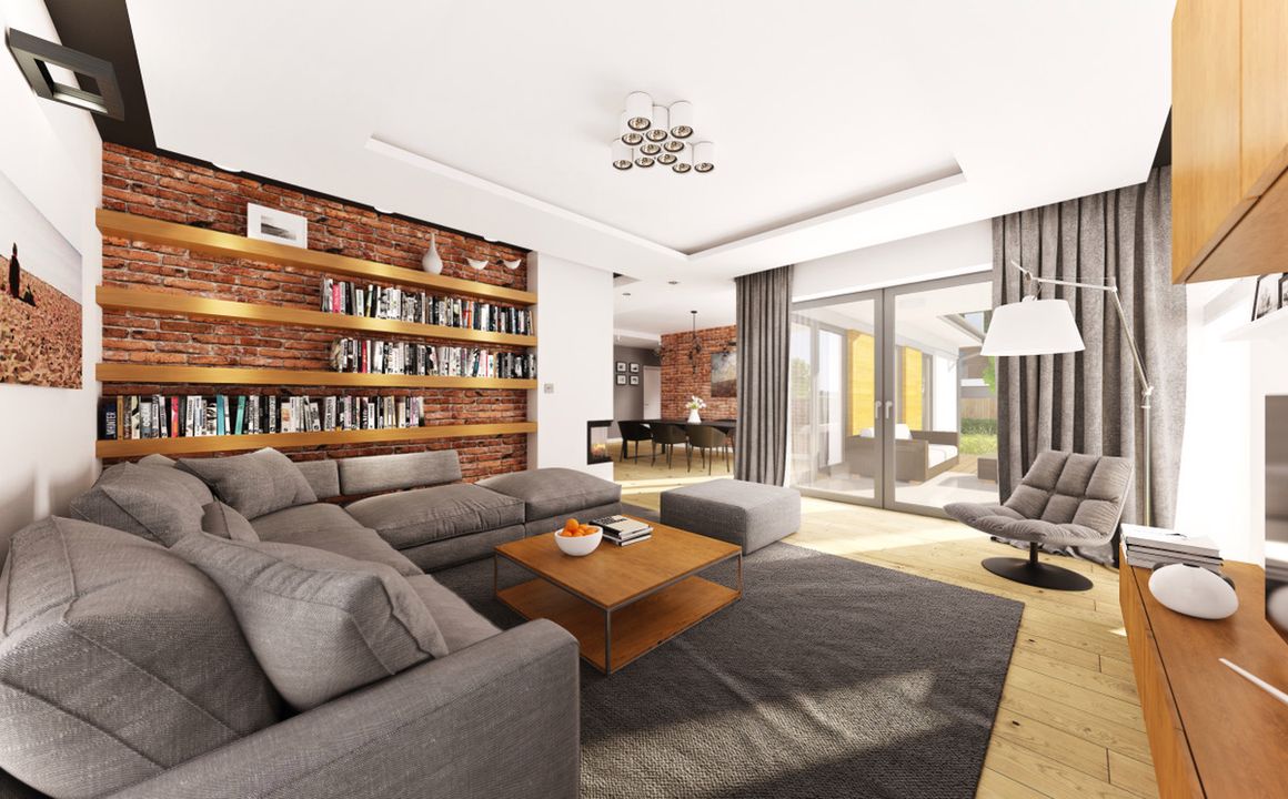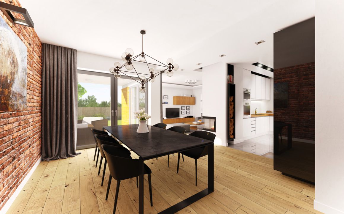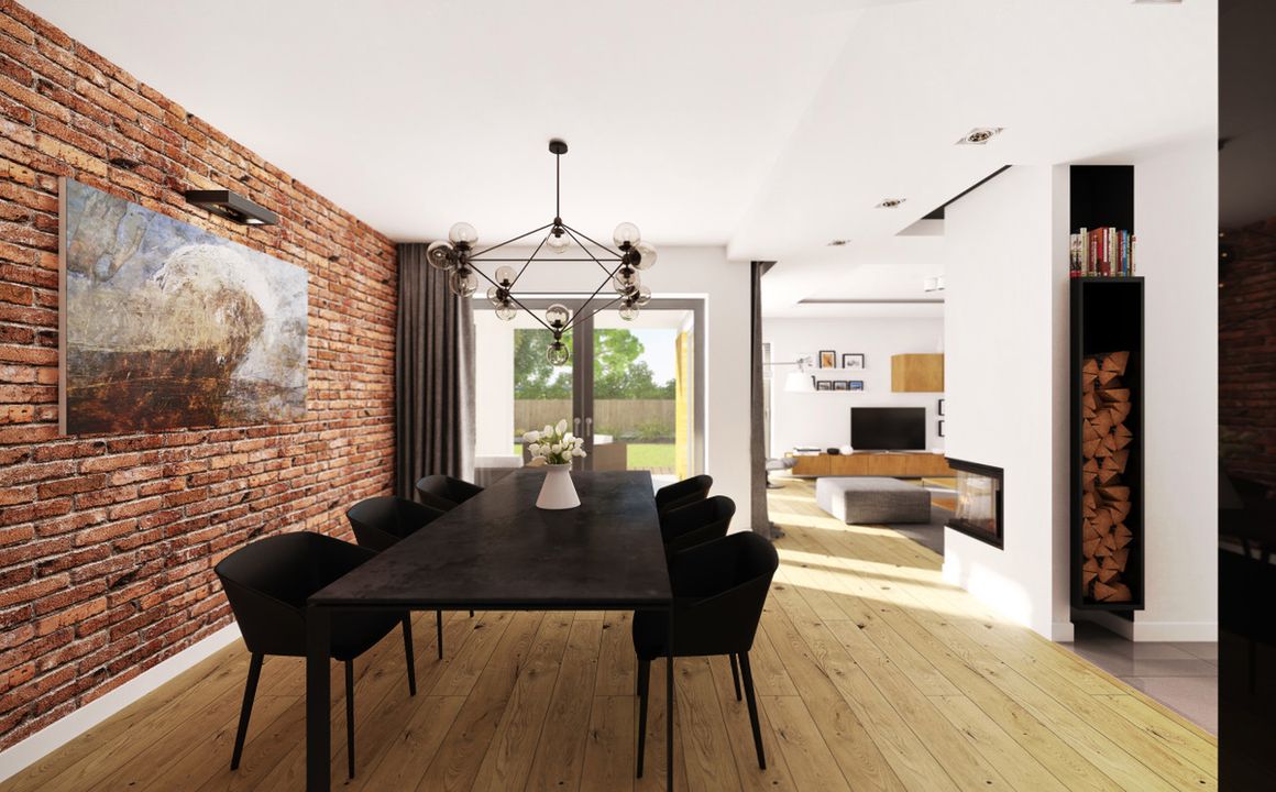 Graficzne opracowanie rzutów poglądowych widocznych na karcie projektu zostało wykonane przez Extradom.pl. Prezentowane przez Extradom.pl wizualizacje wykonane zostały przez autora projektu i należy poczytywać je jedynie za przykład i propozycję wykończenia, wizję architektoniczną autora projektu. Ostateczne wykończenie budynku może nastąpić na wiele sposobów. Szczegółowe rozwiązania zastosowane w oferowanej dokumentacji - w tym również ilość, lokalizacje i wygląd okien, drzwi, kominów - mogą w niewielkim stopniu różnić się od prezentowanej wizualizacji budynku.