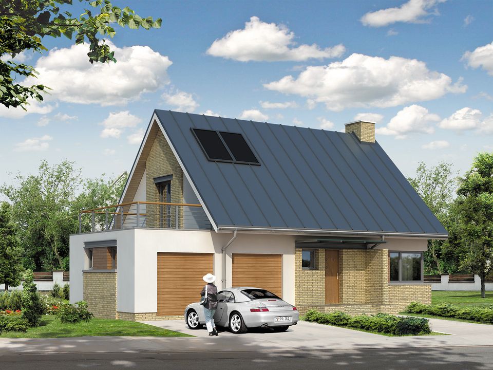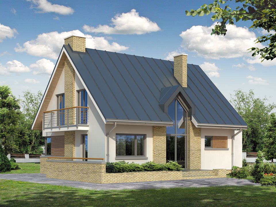 Graficzne opracowanie rzutów poglądowych widocznych na karcie projektu zostało wykonane przez Extradom.pl. Prezentowane przez Extradom.pl wizualizacje wykonane zostały przez autora projektu i należy poczytywać je jedynie za przykład i propozycję wykończenia, wizję architektoniczną autora projektu. Ostateczne wykończenie budynku może nastąpić na wiele sposobów. Szczegółowe rozwiązania zastosowane w oferowanej dokumentacji - w tym również ilość, lokalizacje i wygląd okien, drzwi, kominów - mogą w niewielkim stopniu różnić się od prezentowanej wizualizacji budynku.