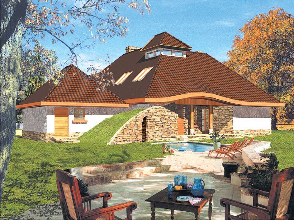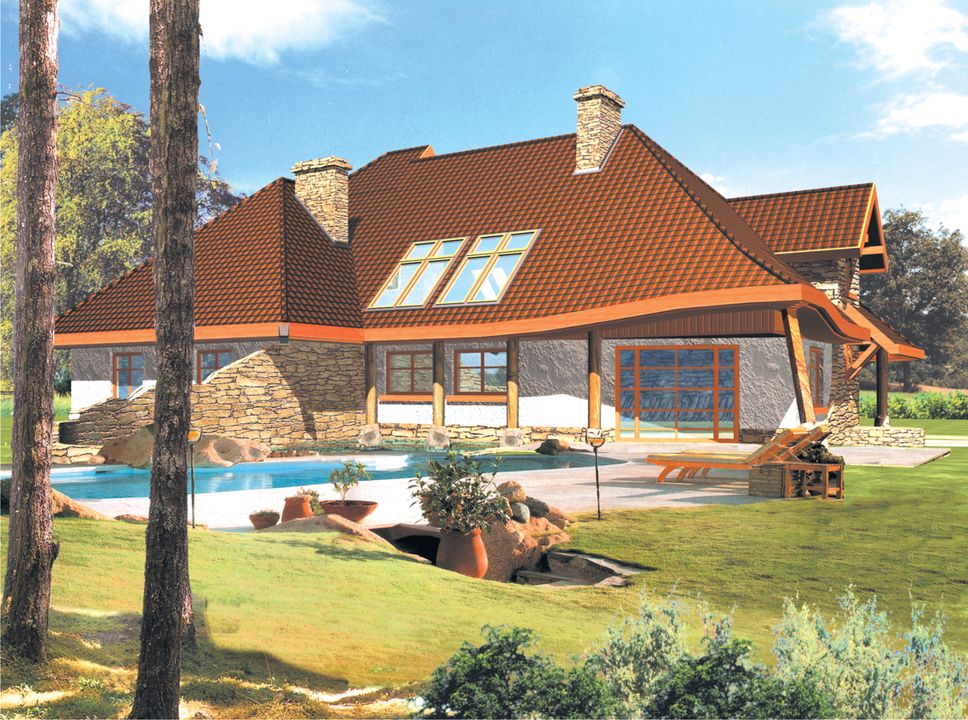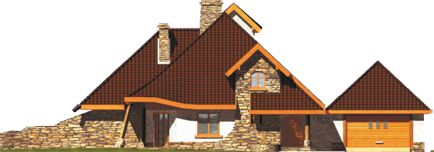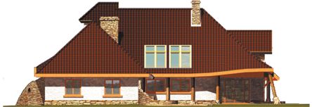 Dom budowany w technologii murowanej ze stropem drewnianym. Dach pokryty dachówką ceramiczną lub cementową. Elewacja wykończona tynkiem, drewnem, kamieniem lub okładziną kamienną. Widoczne są kolumny zewnętrzne - bale drewniane.