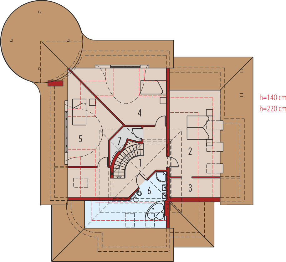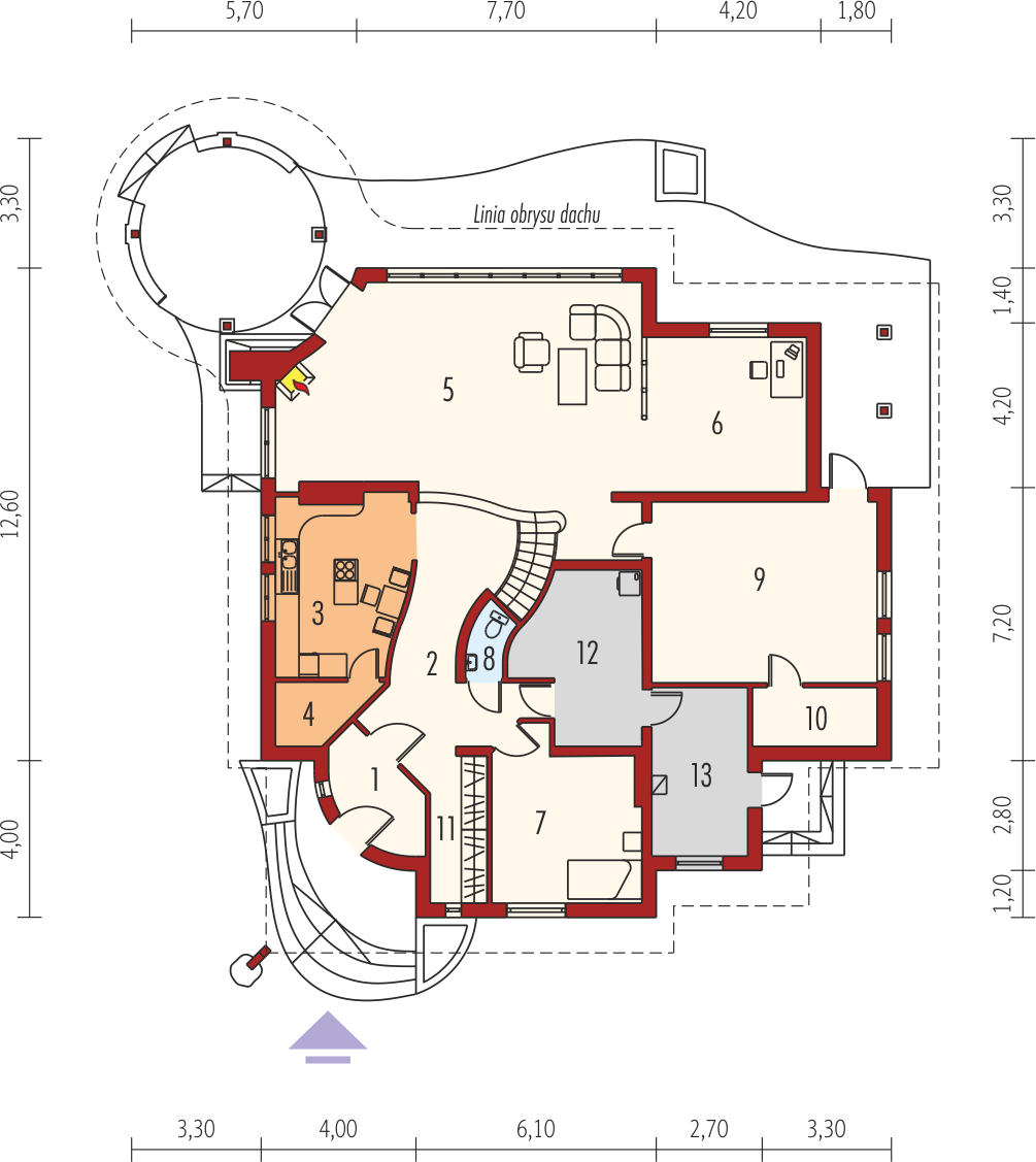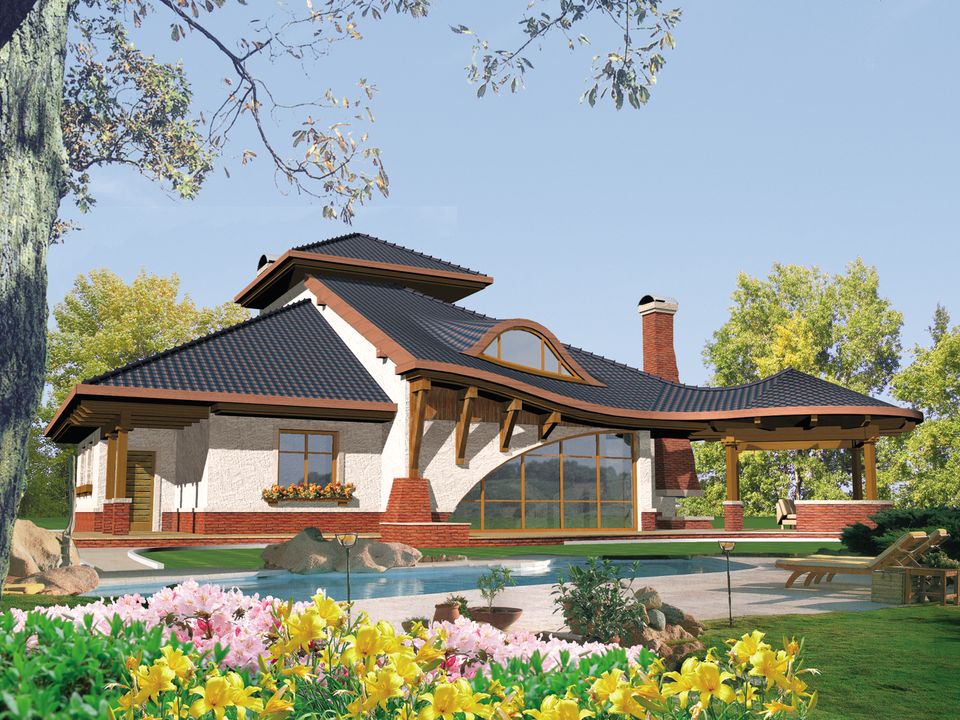 Graficzne opracowanie rzutów poglądowych widocznych na karcie projektu zostało wykonane przez Extradom.pl. Prezentowane przez Extradom.pl wizualizacje wykonane zostały przez autora projektu i należy poczytywać je jedynie za przykład i propozycję wykończenia, wizję architektoniczną autora projektu. Ostateczne wykończenie budynku może nastąpić na wiele sposobów. Szczegółowe rozwiązania zastosowane w oferowanej dokumentacji - w tym również ilość, lokalizacje i wygląd okien, drzwi, kominów - mogą w niewielkim stopniu różnić się od prezentowanej wizualizacji budynku.