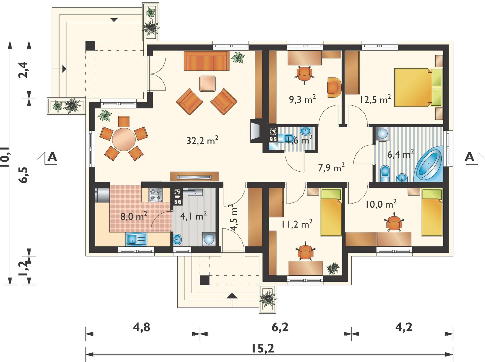 Graficzne opracowanie rzutów poglądowych widocznych na karcie projektu zostało wykonane przez Extradom.pl. Prezentowane przez Extradom.pl wizualizacje wykonane zostały przez autora projektu i należy poczytywać je jedynie za przykład i propozycję wykończenia, wizję architektoniczną autora projektu. Ostateczne wykończenie budynku może nastąpić na wiele sposobów. Szczegółowe rozwiązania zastosowane w oferowanej dokumentacji - w tym również ilość, lokalizacje i wygląd okien, drzwi, kominów - mogą w niewielkim stopniu różnić się od prezentowanej wizualizacji budynku.