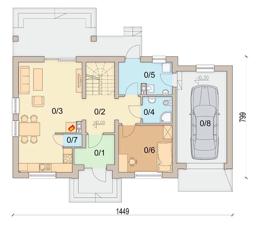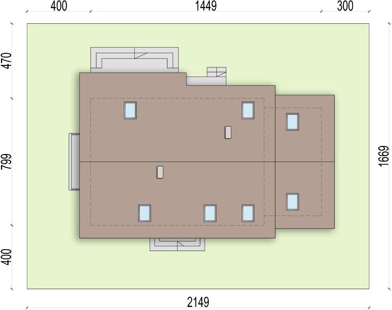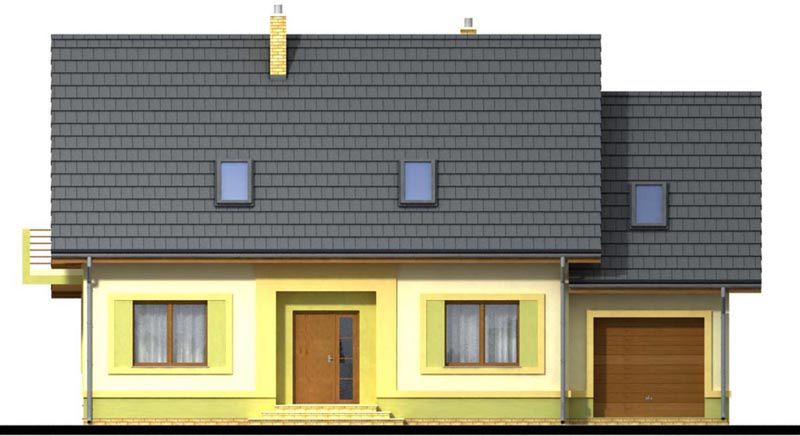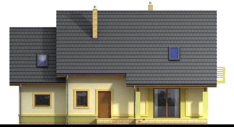 Graficzne opracowanie rzutów poglądowych widocznych na karcie projektu zostało wykonane przez Extradom.pl. Prezentowane przez Extradom.pl wizualizacje wykonane zostały przez autora projektu i należy poczytywać je jedynie za przykład i propozycję wykończenia, wizję architektoniczną autora projektu. Ostateczne wykończenie budynku może nastąpić na wiele sposobów. Szczegółowe rozwiązania zastosowane w oferowanej dokumentacji - w tym również ilość, lokalizacje i wygląd okien, drzwi, kominów - mogą w niewielkim stopniu różnić się od prezentowanej wizualizacji budynku.