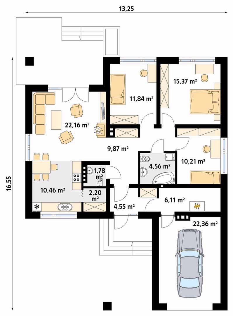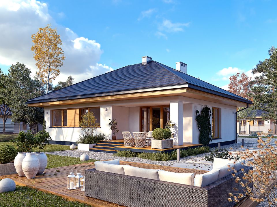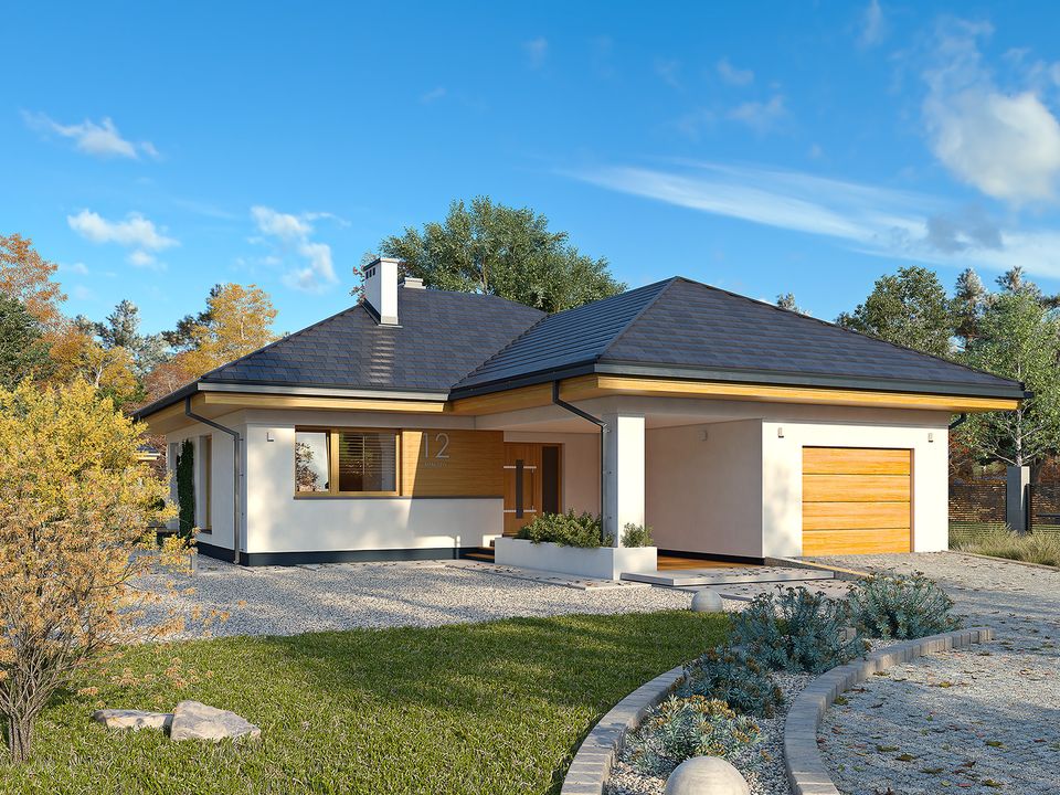 Graficzne opracowanie rzutów poglądowych widocznych na karcie projektu zostało wykonane przez Extradom.pl. Prezentowane przez Extradom.pl wizualizacje wykonane zostały przez autora projektu i należy poczytywać je jedynie za przykład i propozycję wykończenia, wizję architektoniczną autora projektu. Ostateczne wykończenie budynku może nastąpić na wiele sposobów. Szczegółowe rozwiązania zastosowane w oferowanej dokumentacji - w tym również ilość, lokalizacje i wygląd okien, drzwi, kominów - mogą w niewielkim stopniu różnić się od prezentowanej wizualizacji budynku.