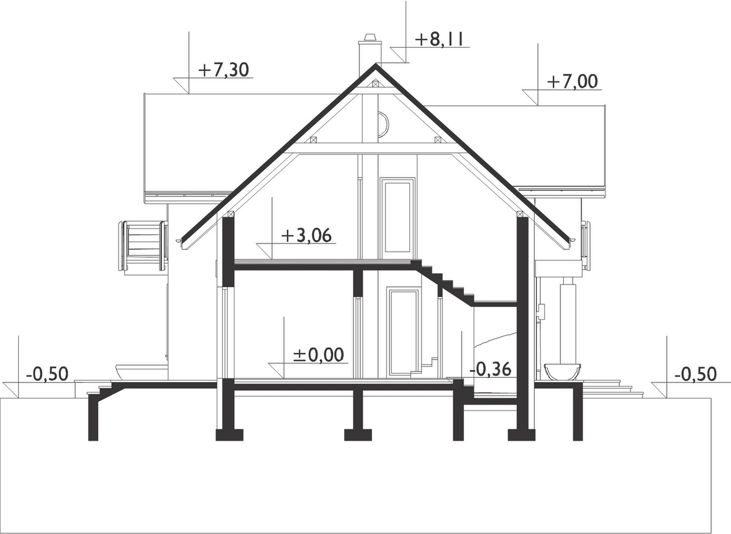Wersja technologiczna: murowana - beton komórkowy. Strop: żelbetowy monolityczny. Typ schodów: płytowe żelbetowe. Konstrukcja dachu: drewniana krokwiowo-jętkowa. Typ ogrzewania: Kocioł na gaz. Dostępna wersja z pompą ciepła: Tak. Ściany zewnętrzne: 30 cm beton komórkowy. Ściany wewnętrzne: 24 cm beton komórkowy. Ściany wewnętrzne działowe: 11 cm beton komórkowy.