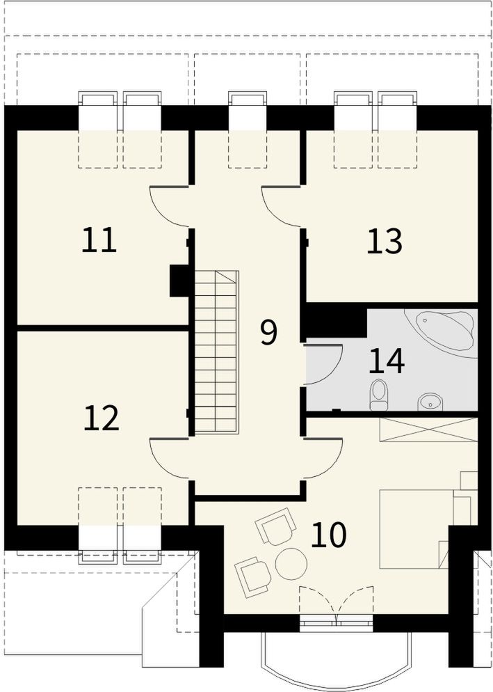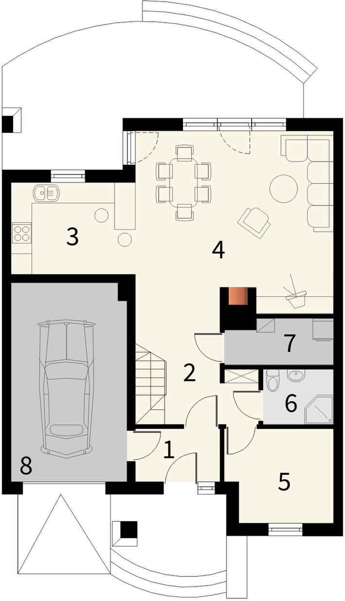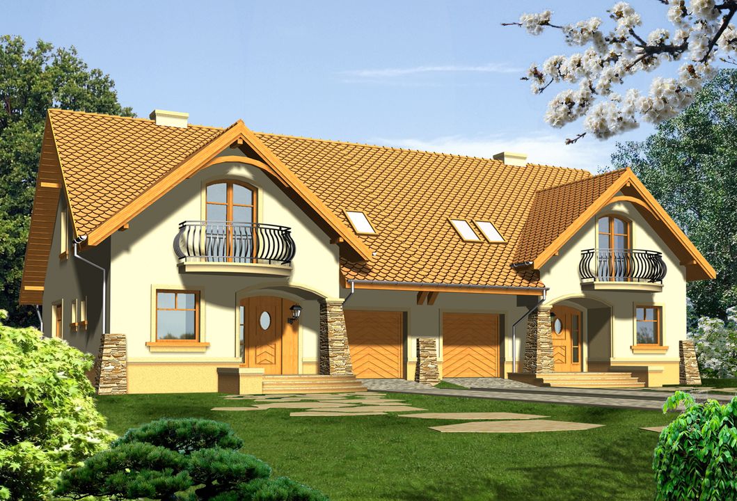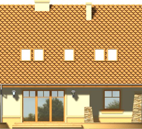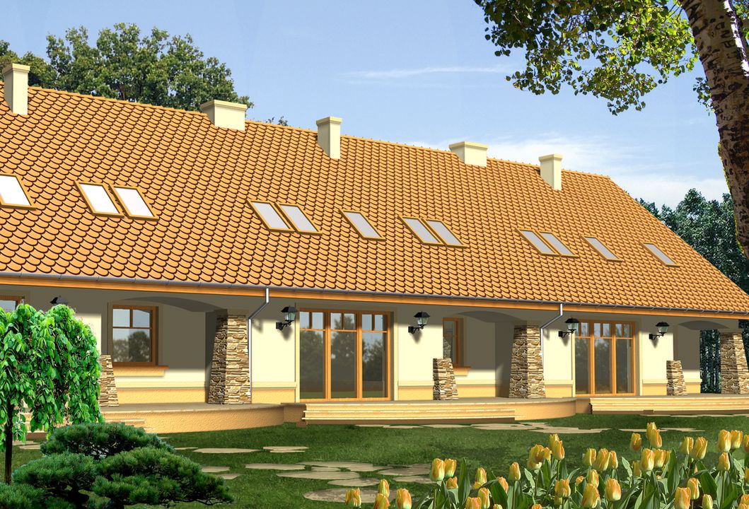Graficzne opracowanie rzutów poglądowych widocznych na karcie projektu zostało wykonane przez Extradom.pl. Prezentowane przez Extradom.pl wizualizacje wykonane zostały przez autora projektu i należy poczytywać je jedynie za przykład i propozycję wykończenia, wizję architektoniczną autora projektu. Ostateczne wykończenie budynku może nastąpić na wiele sposobów. Szczegółowe rozwiązania zastosowane w oferowanej dokumentacji - w tym również ilość, lokalizacje i wygląd okien, drzwi, kominów - mogą w niewielkim stopniu różnić się od prezentowanej wizualizacji budynku.
