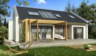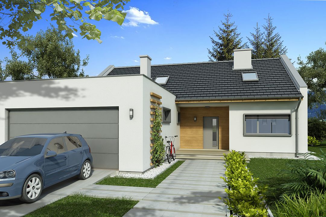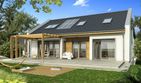 Graficzne opracowanie rzutów poglądowych widocznych na karcie projektu zostało wykonane przez Extradom.pl. Prezentowane przez Extradom.pl wizualizacje wykonane zostały przez autora projektu i należy poczytywać je jedynie za przykład i propozycję wykończenia, wizję architektoniczną autora projektu. Ostateczne wykończenie budynku może nastąpić na wiele sposobów. Szczegółowe rozwiązania zastosowane w oferowanej dokumentacji - w tym również ilość, lokalizacje i wygląd okien, drzwi, kominów - mogą w niewielkim stopniu różnić się od prezentowanej wizualizacji budynku.