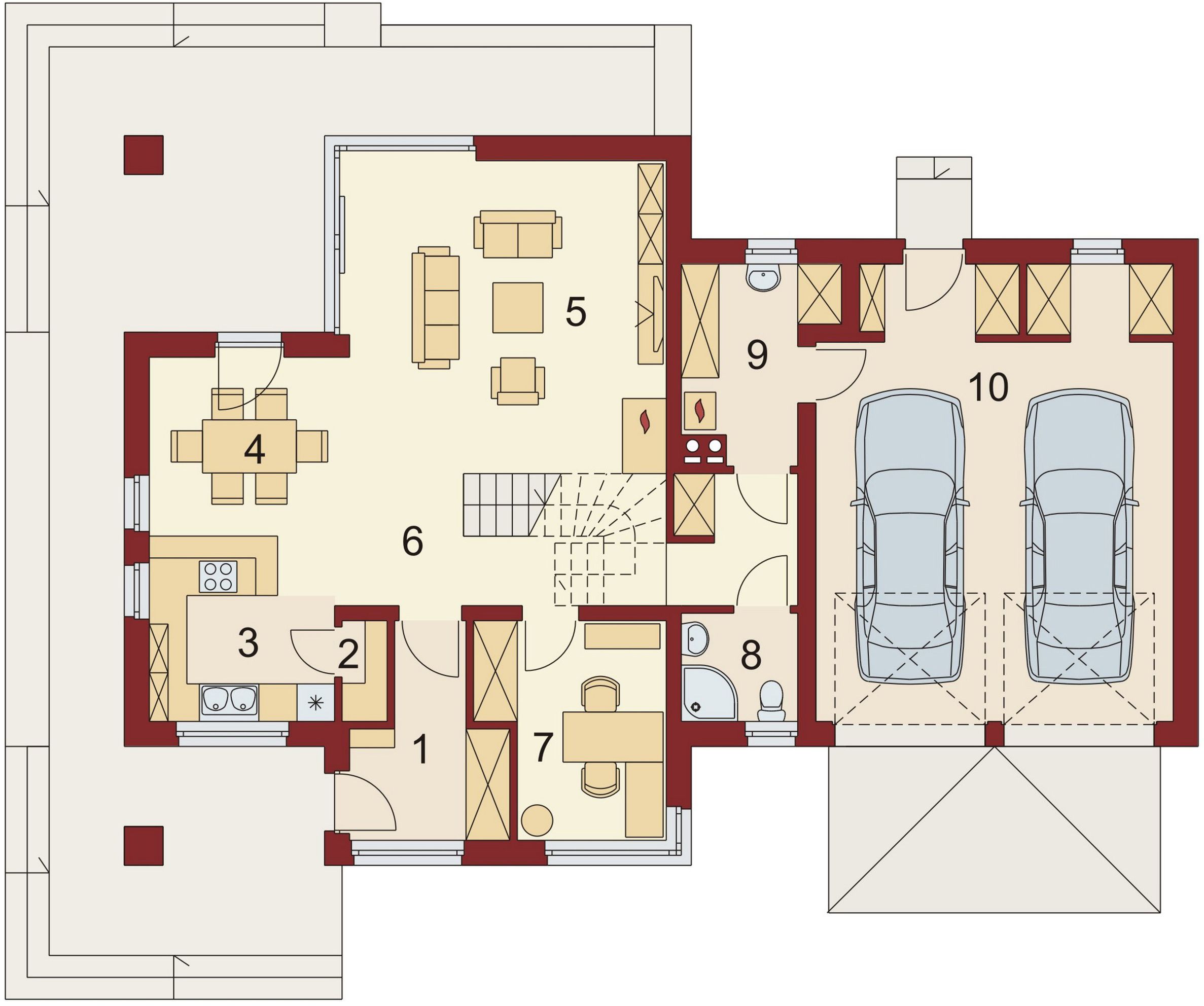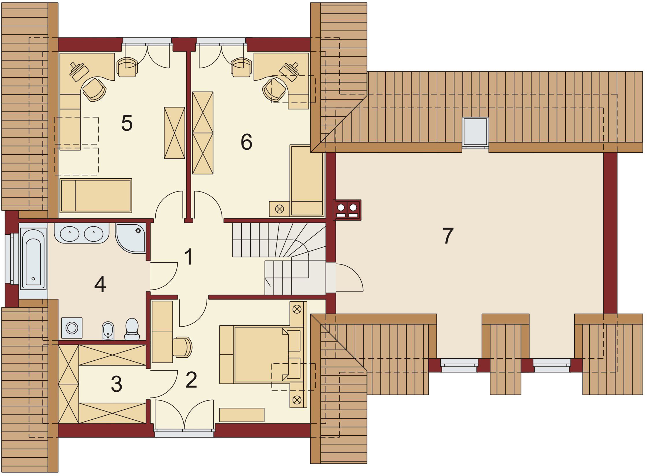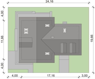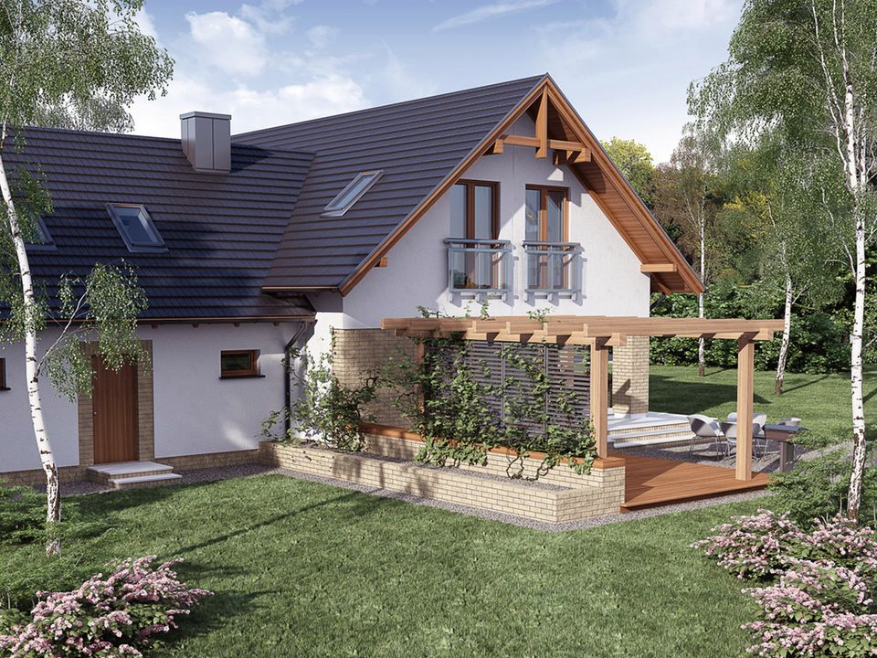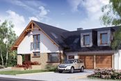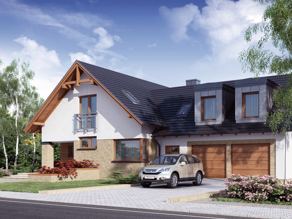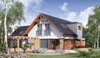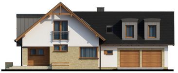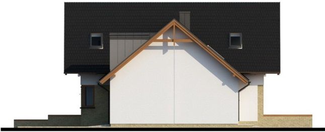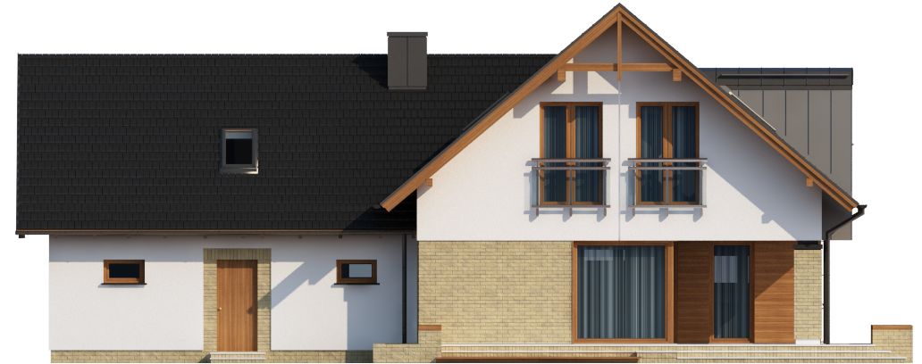 Graficzne opracowanie rzutów poglądowych widocznych na karcie projektu zostało wykonane przez Extradom.pl. Prezentowane przez Extradom.pl wizualizacje wykonane zostały przez autora projektu i należy poczytywać je jedynie za przykład i propozycję wykończenia, wizję architektoniczną autora projektu. Ostateczne wykończenie budynku może nastąpić na wiele sposobów. Szczegółowe rozwiązania zastosowane w oferowanej dokumentacji - w tym również ilość, lokalizacje i wygląd okien, drzwi, kominów - mogą w niewielkim stopniu różnić się od prezentowanej wizualizacji budynku.