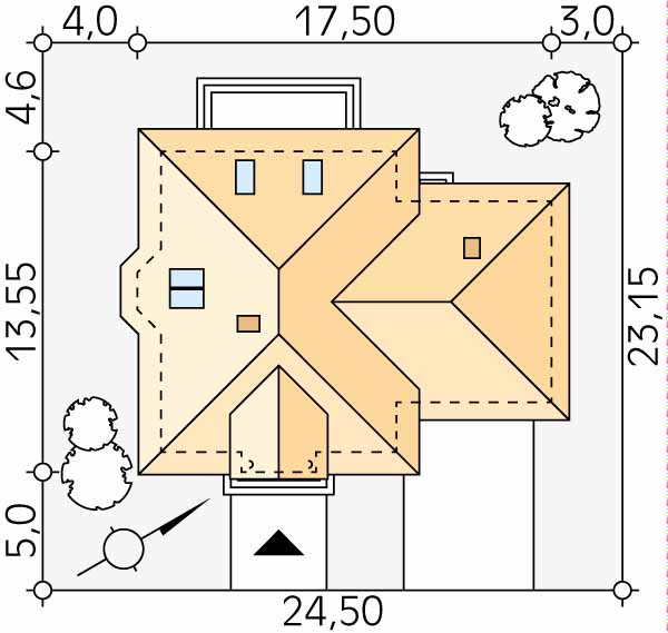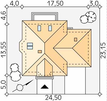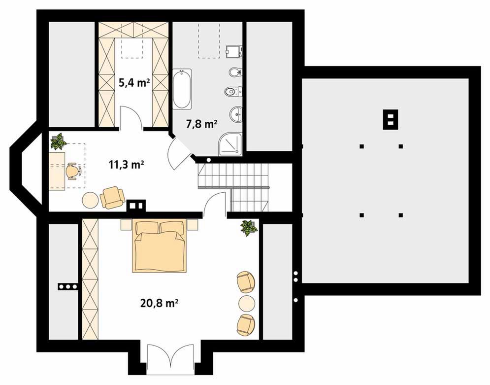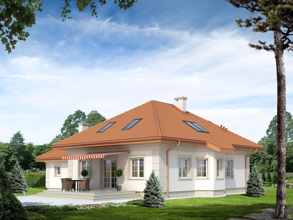 Graficzne opracowanie rzutów poglądowych widocznych na karcie projektu zostało wykonane przez Extradom.pl. Prezentowane przez Extradom.pl wizualizacje wykonane zostały przez autora projektu i należy poczytywać je jedynie za przykład i propozycję wykończenia, wizję architektoniczną autora projektu. Ostateczne wykończenie budynku może nastąpić na wiele sposobów. Szczegółowe rozwiązania zastosowane w oferowanej dokumentacji - w tym również ilość, lokalizacje i wygląd okien, drzwi, kominów - mogą w niewielkim stopniu różnić się od prezentowanej wizualizacji budynku.