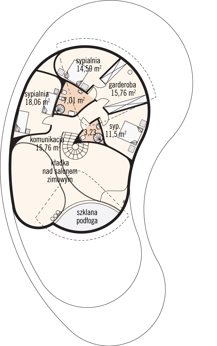 Graficzne opracowanie rzutów poglądowych widocznych na karcie projektu zostało wykonane przez Extradom.pl. Prezentowane przez Extradom.pl wizualizacje wykonane zostały przez autora projektu i należy poczytywać je jedynie za przykład i propozycję wykończenia, wizję architektoniczną autora projektu. Ostateczne wykończenie budynku może nastąpić na wiele sposobów. Szczegółowe rozwiązania zastosowane w oferowanej dokumentacji - w tym również ilość, lokalizacje i wygląd okien, drzwi, kominów - mogą w niewielkim stopniu różnić się od prezentowanej wizualizacji budynku.