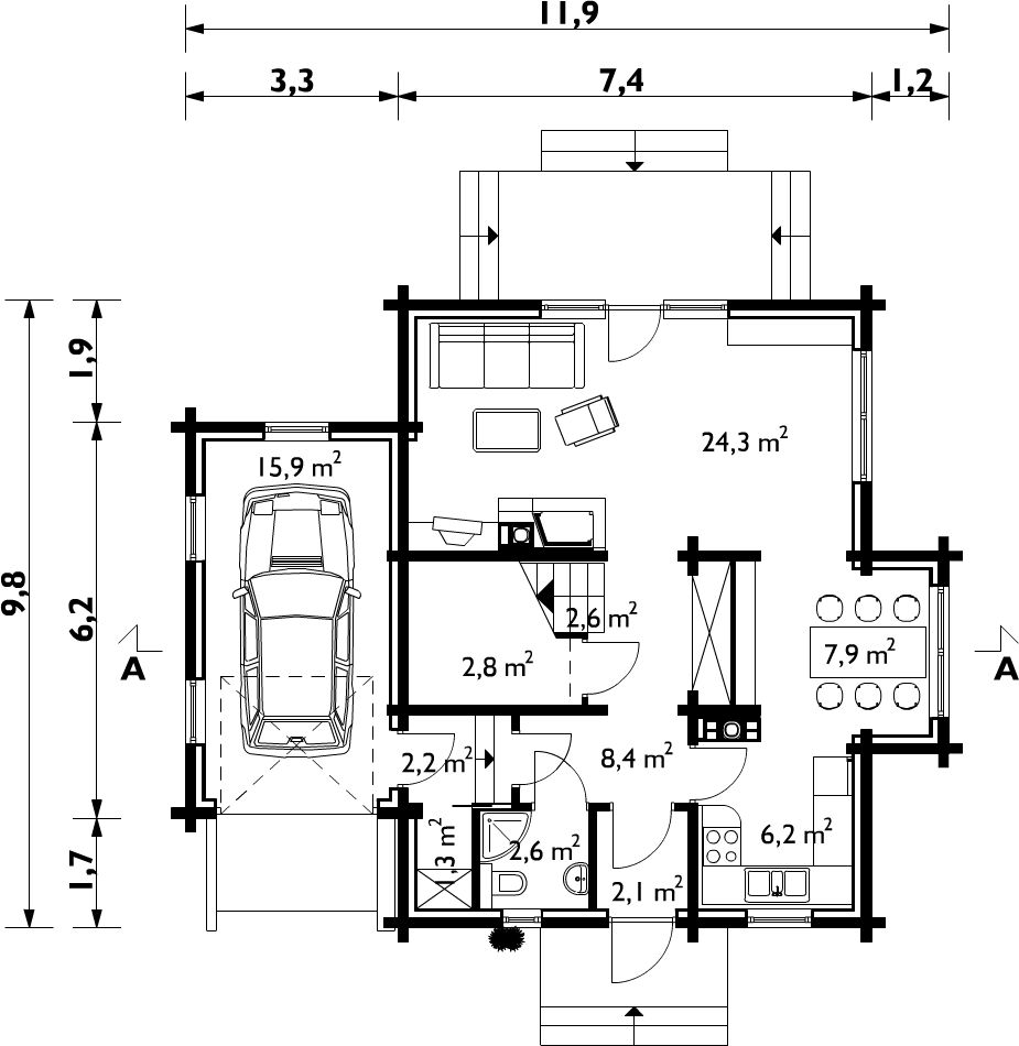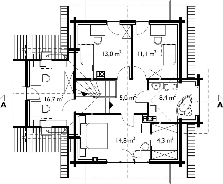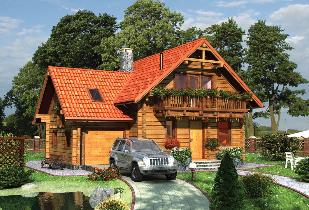 Technologia i konstrukcja: bal drewniany. Ściany zewnętrzne: bale drewniane gr. 160 mm + ocieplenie z wełny mineralnej + wykończenie. Ściany wewnętrzne: konstrukcyjne: bale drewniane gr. 160 mm, szkieletowe drewniane; działowe: szkieletowe drewniane. Strop: drewniane. Konstrukcja dachu: tradycyjna drewniana. Rodzaj schodów: drewniane. Typ ogrzewania: kocioł na gaz. Pokrycie dachu: dachówka ceramiczna. Elewacja: podmurówka: okładzina z betonowego kamienia elewacyjnego.