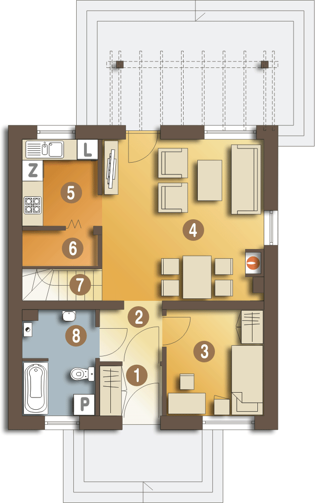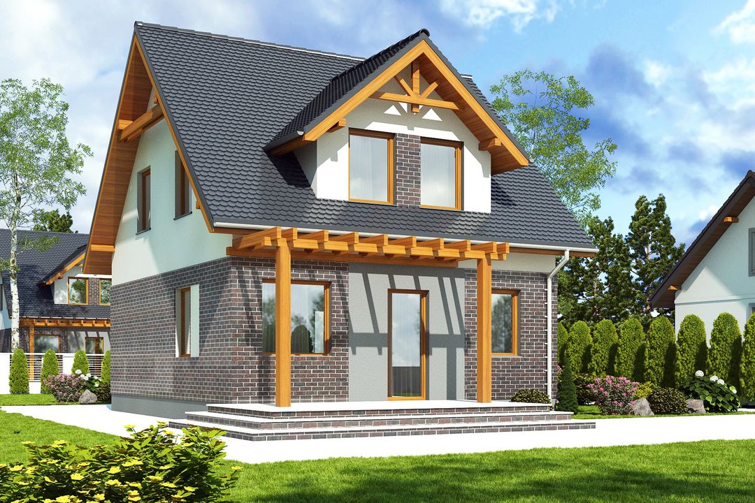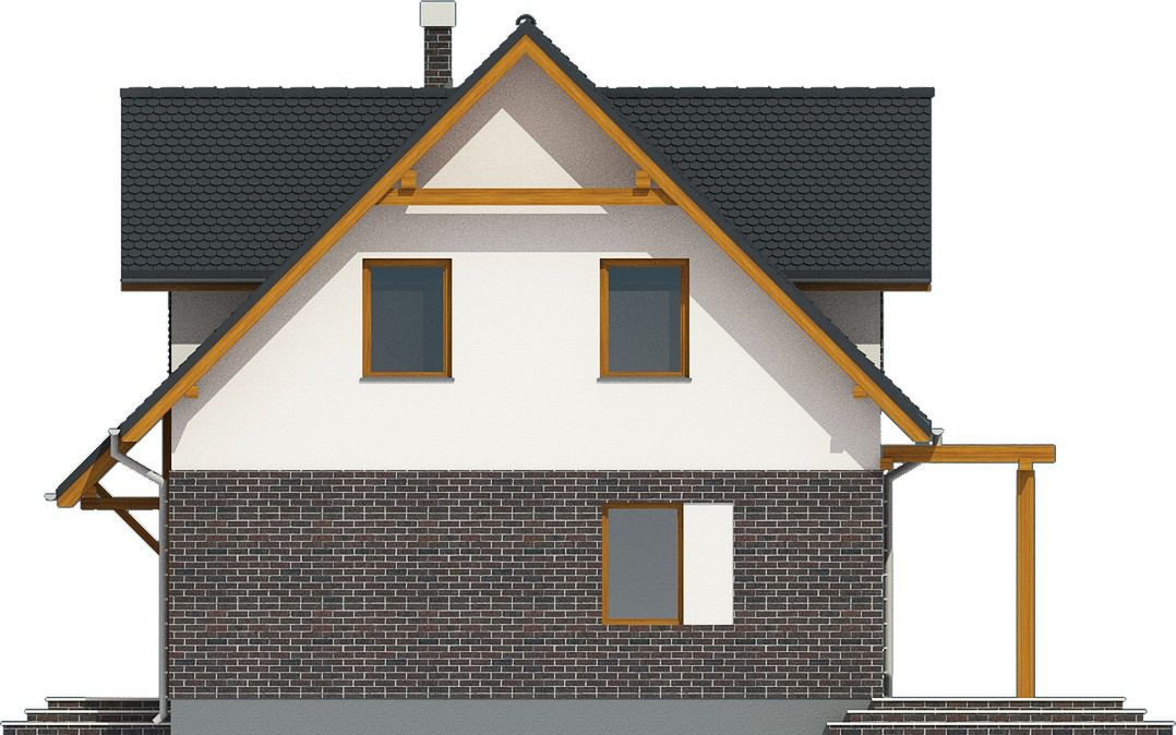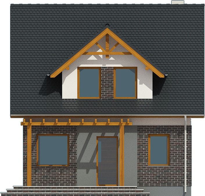 Graficzne opracowanie rzutów poglądowych widocznych na karcie projektu zostało wykonane przez Extradom.pl. Prezentowane przez Extradom.pl wizualizacje wykonane zostały przez autora projektu i należy poczytywać je jedynie za przykład i propozycję wykończenia, wizję architektoniczną autora projektu. Ostateczne wykończenie budynku może nastąpić na wiele sposobów. Szczegółowe rozwiązania zastosowane w oferowanej dokumentacji - w tym również ilość, lokalizacje i wygląd okien, drzwi, kominów - mogą w niewielkim stopniu różnić się od prezentowanej wizualizacji budynku.
