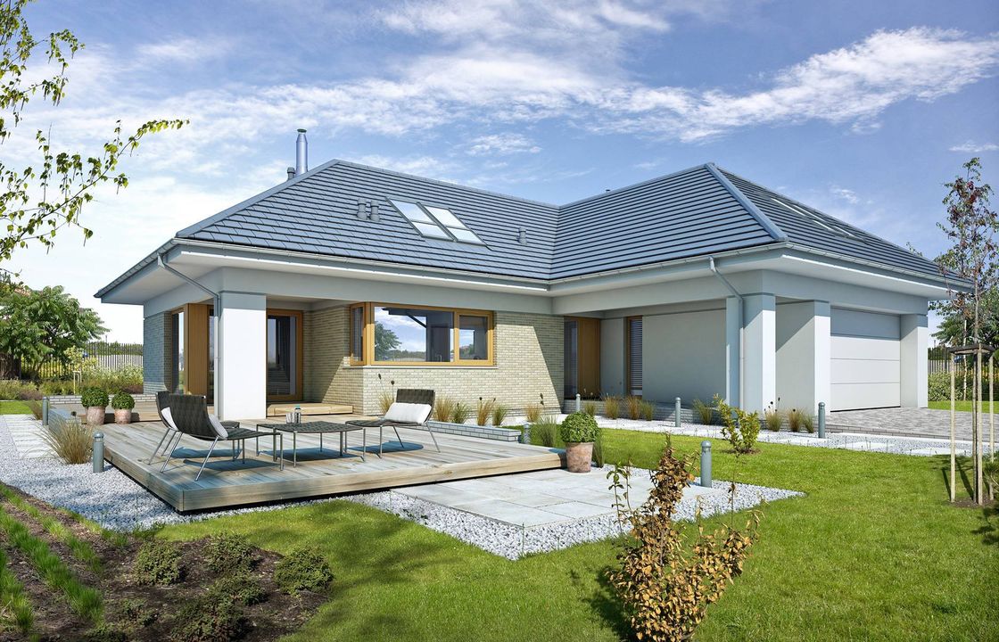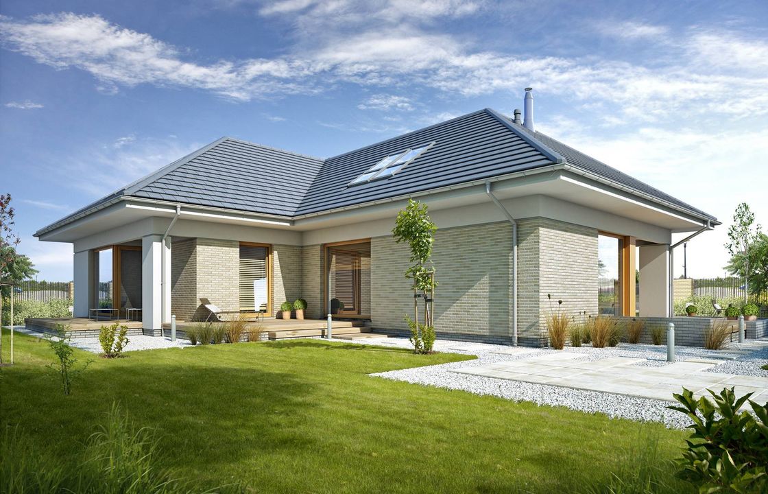 Graficzne opracowanie rzutów poglądowych widocznych na karcie projektu zostało wykonane przez Extradom.pl. Prezentowane przez Extradom.pl wizualizacje wykonane zostały przez autora projektu i należy poczytywać je jedynie za przykład i propozycję wykończenia, wizję architektoniczną autora projektu. Ostateczne wykończenie budynku może nastąpić na wiele sposobów. Szczegółowe rozwiązania zastosowane w oferowanej dokumentacji - w tym również ilość, lokalizacje i wygląd okien, drzwi, kominów - mogą w niewielkim stopniu różnić się od prezentowanej wizualizacji budynku.