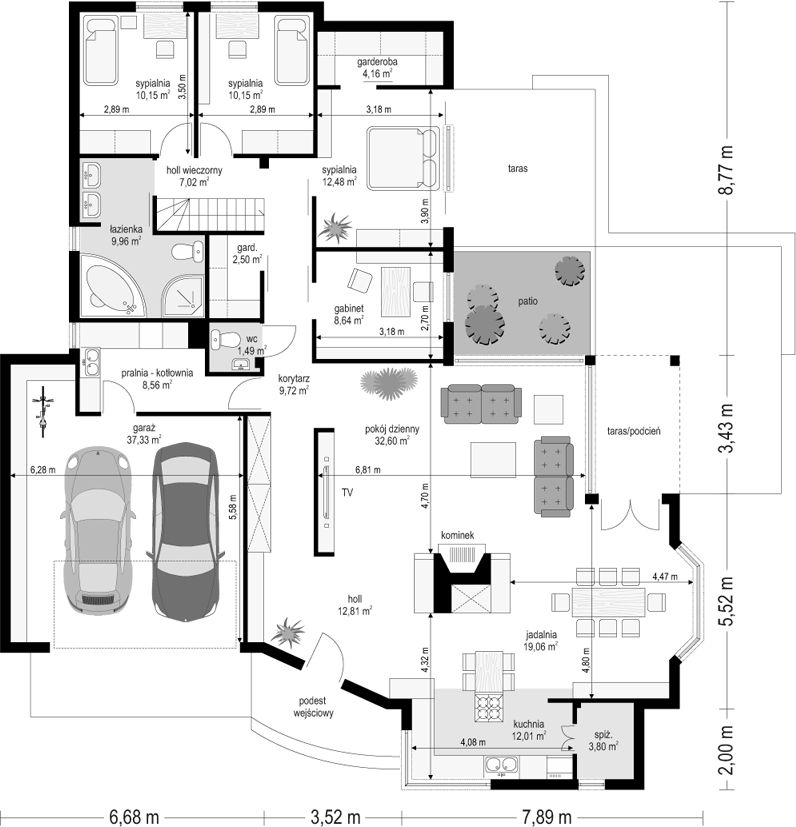 Graficzne opracowanie rzutów poglądowych widocznych na karcie projektu zostało wykonane przez Extradom.pl. Prezentowane przez Extradom.pl wizualizacje wykonane zostały przez autora projektu i należy poczytywać je jedynie za przykład i propozycję wykończenia, wizję architektoniczną autora projektu. Ostateczne wykończenie budynku może nastąpić na wiele sposobów. Szczegółowe rozwiązania zastosowane w oferowanej dokumentacji - w tym również ilość, lokalizacje i wygląd okien, drzwi, kominów - mogą w niewielkim stopniu różnić się od prezentowanej wizualizacji budynku.