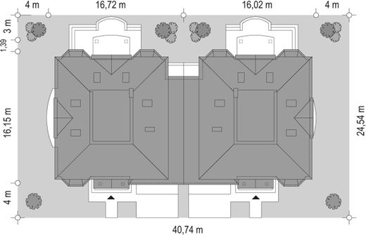 Fundamenty: betonowe wylewane. Ściany zewnętrzne: dwuwarstwowe bloczki Optiroc 24 + 12 styropian (lub wełna). Strop: Teriva. Elewacje: tynk cienkowarstwowy. Pokrycie dachu: dachówka i papa termozgrzewalna. Nachylenie dachu: 30 i 33 stopnie.