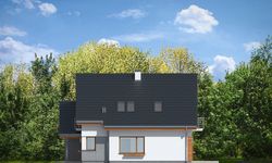 Graficzne opracowanie rzutów poglądowych widocznych na karcie projektu zostało wykonane przez Extradom.pl. Prezentowane przez Extradom.pl wizualizacje wykonane zostały przez autora projektu i należy poczytywać je jedynie za przykład i propozycję wykończenia, wizję architektoniczną autora projektu. Ostateczne wykończenie budynku może nastąpić na wiele sposobów. Szczegółowe rozwiązania zastosowane w oferowanej dokumentacji - w tym również ilość, lokalizacje i wygląd okien, drzwi, kominów - mogą w niewielkim stopniu różnić się od prezentowanej wizualizacji budynku.