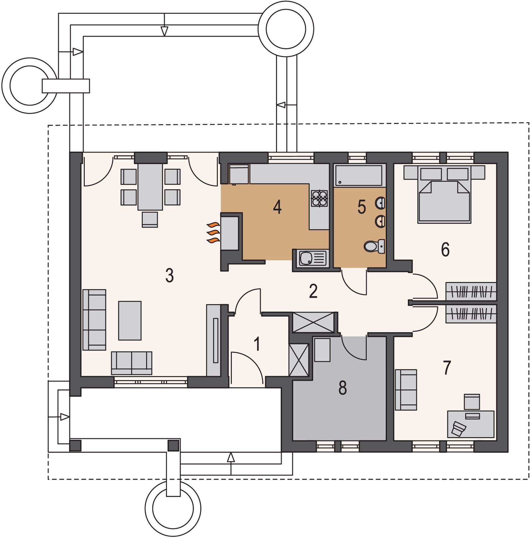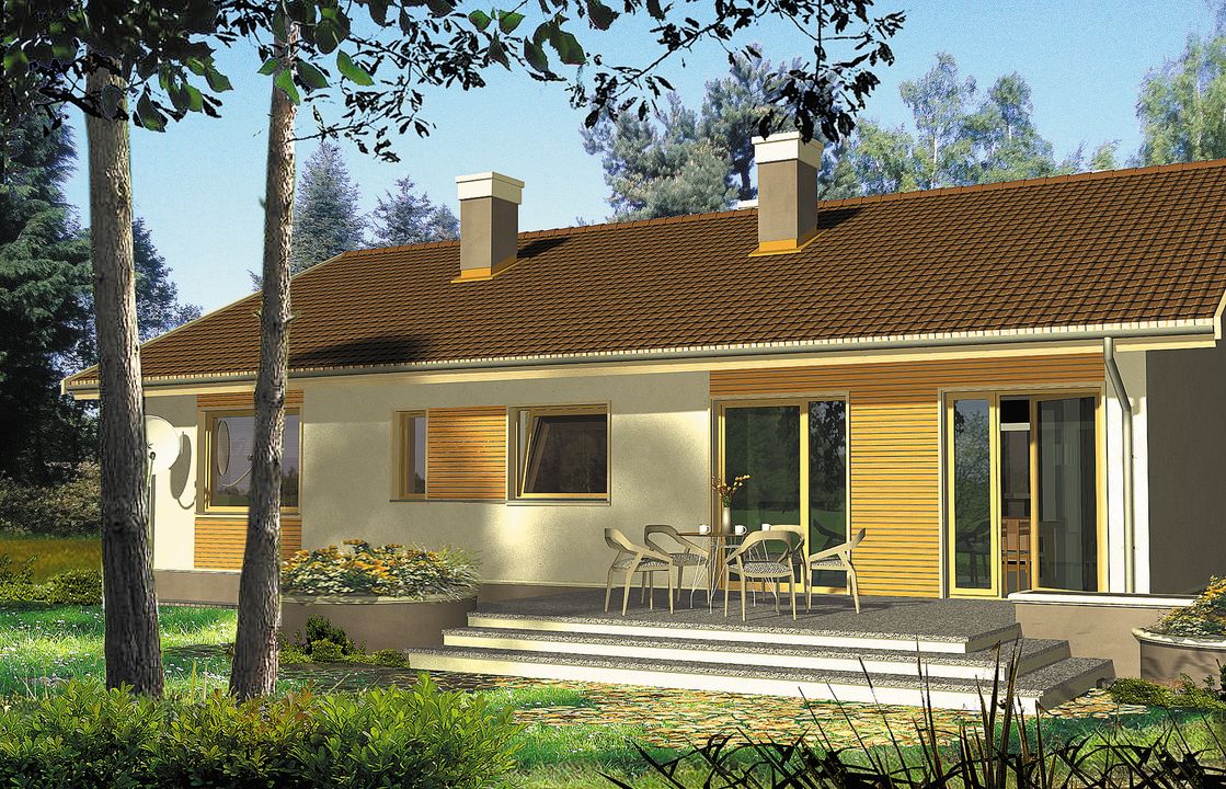 Graficzne opracowanie rzutów poglądowych widocznych na karcie projektu zostało wykonane przez Extradom.pl. Prezentowane przez Extradom.pl wizualizacje wykonane zostały przez autora projektu i należy poczytywać je jedynie za przykład i propozycję wykończenia, wizję architektoniczną autora projektu. Ostateczne wykończenie budynku może nastąpić na wiele sposobów. Szczegółowe rozwiązania zastosowane w oferowanej dokumentacji - w tym również ilość, lokalizacje i wygląd okien, drzwi, kominów - mogą w niewielkim stopniu różnić się od prezentowanej wizualizacji budynku.