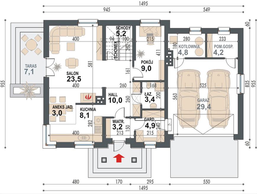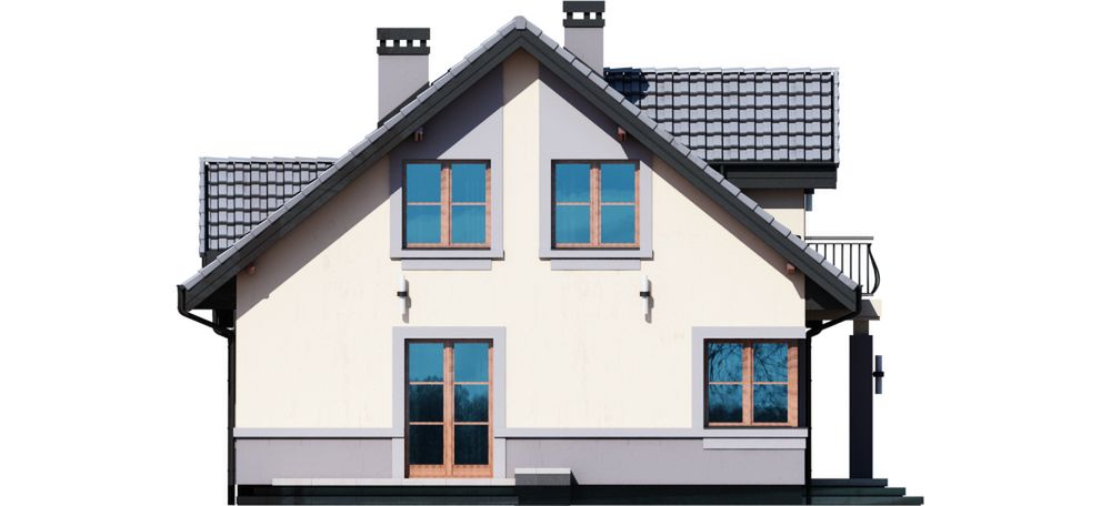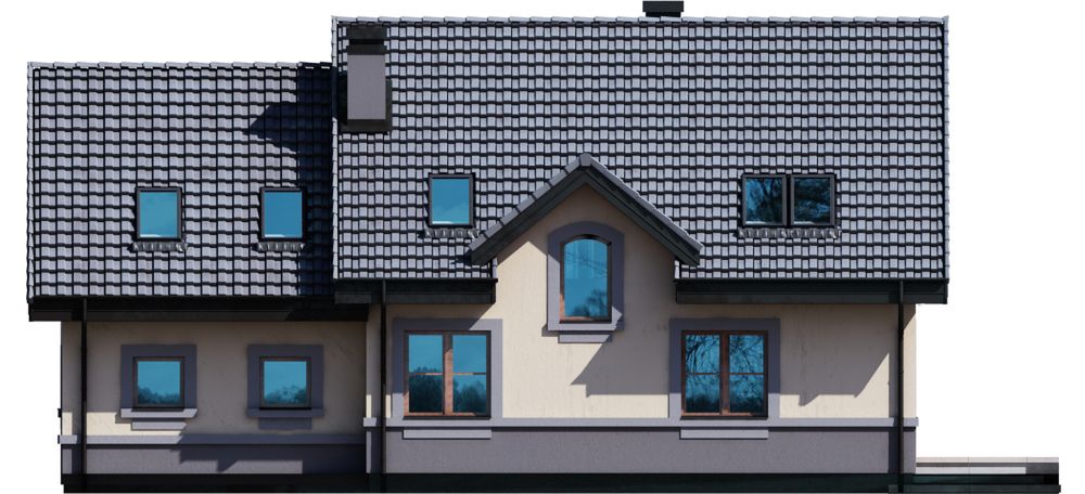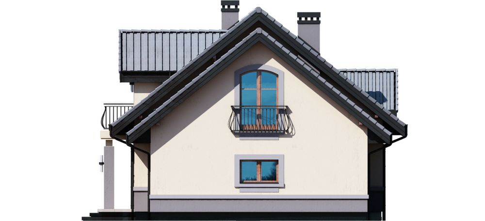 Graficzne opracowanie rzutów poglądowych widocznych na karcie projektu zostało wykonane przez Extradom.pl. Prezentowane przez Extradom.pl wizualizacje wykonane zostały przez autora projektu i należy poczytywać je jedynie za przykład i propozycję wykończenia, wizję architektoniczną autora projektu. Ostateczne wykończenie budynku może nastąpić na wiele sposobów. Szczegółowe rozwiązania zastosowane w oferowanej dokumentacji - w tym również ilość, lokalizacje i wygląd okien, drzwi, kominów - mogą w niewielkim stopniu różnić się od prezentowanej wizualizacji budynku.
