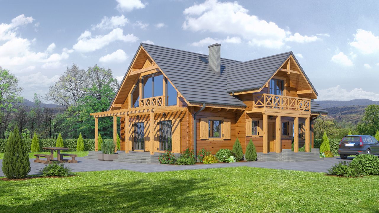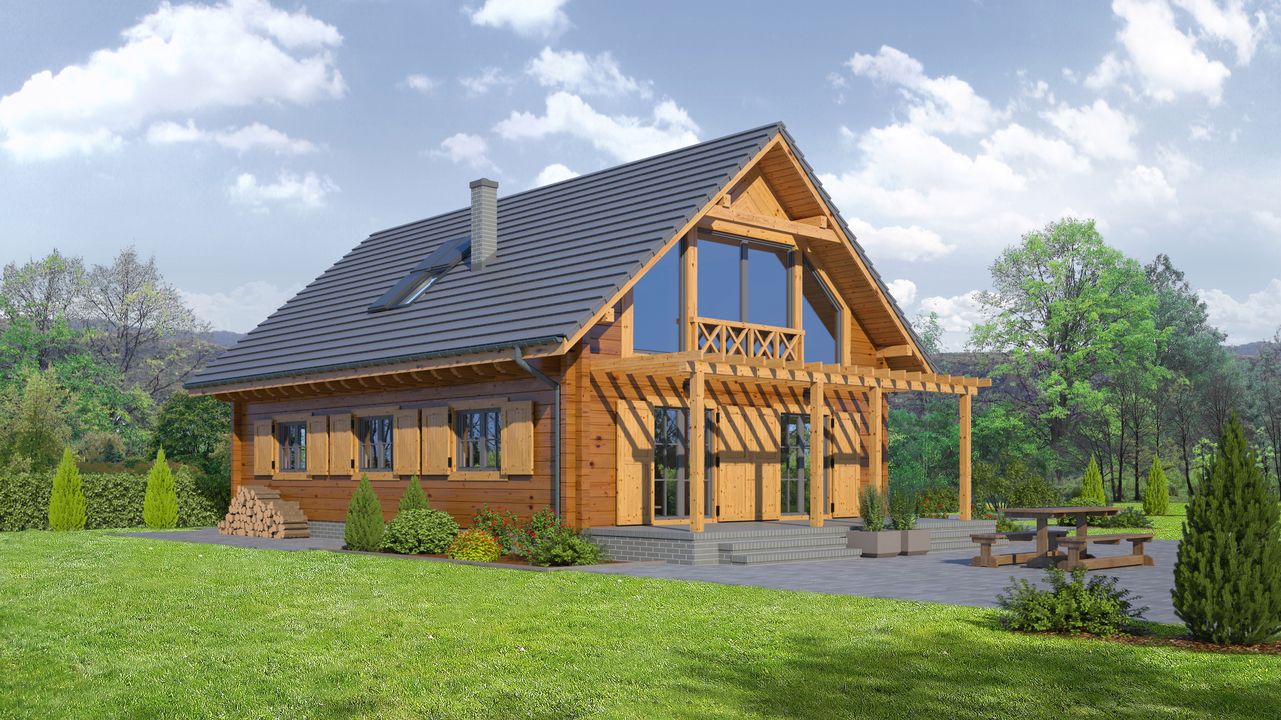 Graficzne opracowanie rzutów poglądowych widocznych na karcie projektu zostało wykonane przez Extradom.pl. Prezentowane przez Extradom.pl wizualizacje wykonane zostały przez autora projektu i należy poczytywać je jedynie za przykład i propozycję wykończenia, wizję architektoniczną autora projektu. Ostateczne wykończenie budynku może nastąpić na wiele sposobów. Szczegółowe rozwiązania zastosowane w oferowanej dokumentacji - w tym również ilość, lokalizacje i wygląd okien, drzwi, kominów - mogą w niewielkim stopniu różnić się od prezentowanej wizualizacji budynku.