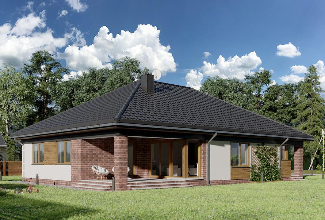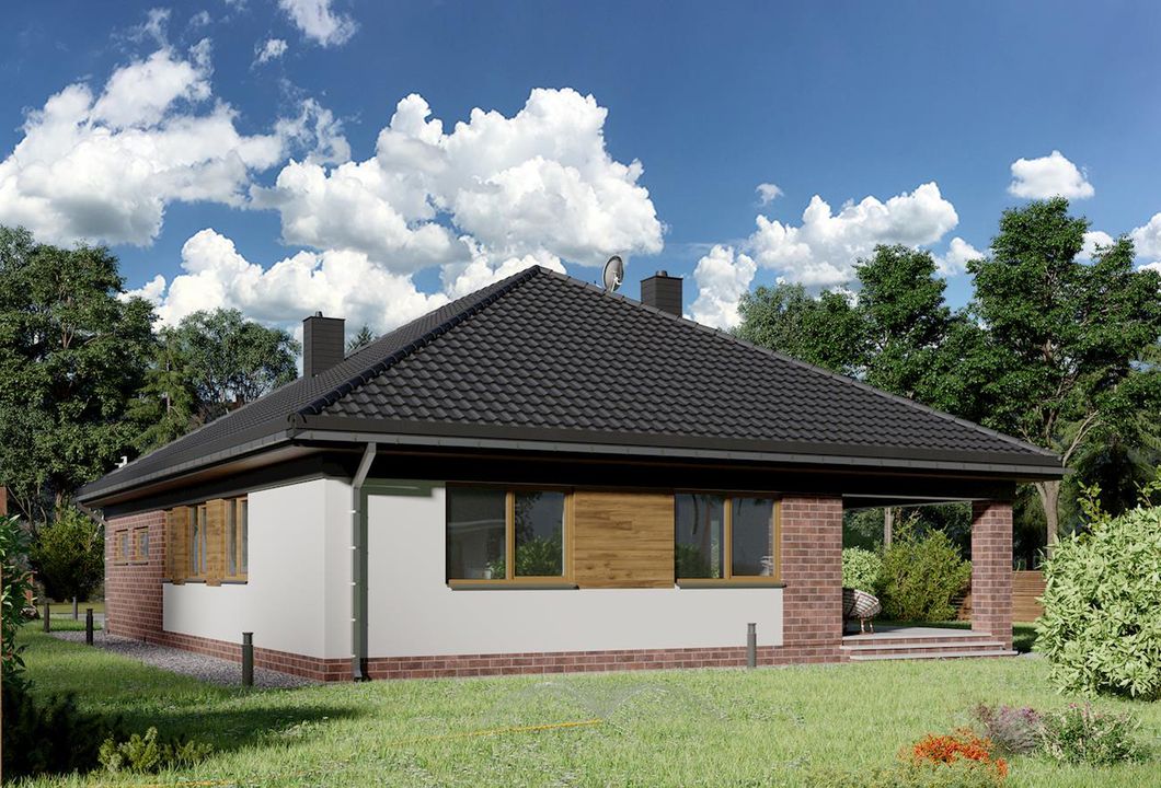 Graficzne opracowanie rzutów poglądowych widocznych na karcie projektu zostało wykonane przez Extradom.pl. Prezentowane przez Extradom.pl wizualizacje wykonane zostały przez autora projektu i należy poczytywać je jedynie za przykład i propozycję wykończenia, wizję architektoniczną autora projektu. Ostateczne wykończenie budynku może nastąpić na wiele sposobów. Szczegółowe rozwiązania zastosowane w oferowanej dokumentacji - w tym również ilość, lokalizacje i wygląd okien, drzwi, kominów - mogą w niewielkim stopniu różnić się od prezentowanej wizualizacji budynku.