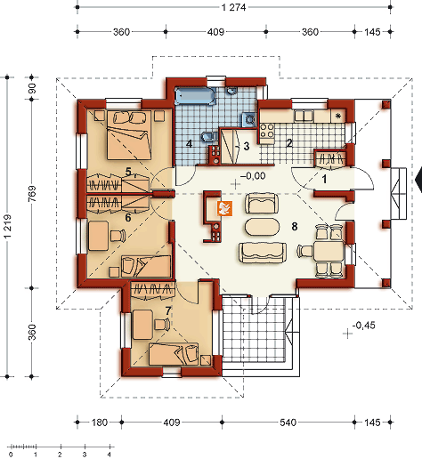 Graficzne opracowanie rzutów poglądowych widocznych na karcie projektu zostało wykonane przez Extradom.pl. Prezentowane przez Extradom.pl wizualizacje wykonane zostały przez autora projektu i należy poczytywać je jedynie za przykład i propozycję wykończenia, wizję architektoniczną autora projektu. Ostateczne wykończenie budynku może nastąpić na wiele sposobów. Szczegółowe rozwiązania zastosowane w oferowanej dokumentacji - w tym również ilość, lokalizacje i wygląd okien, drzwi, kominów - mogą w niewielkim stopniu różnić się od prezentowanej wizualizacji budynku.