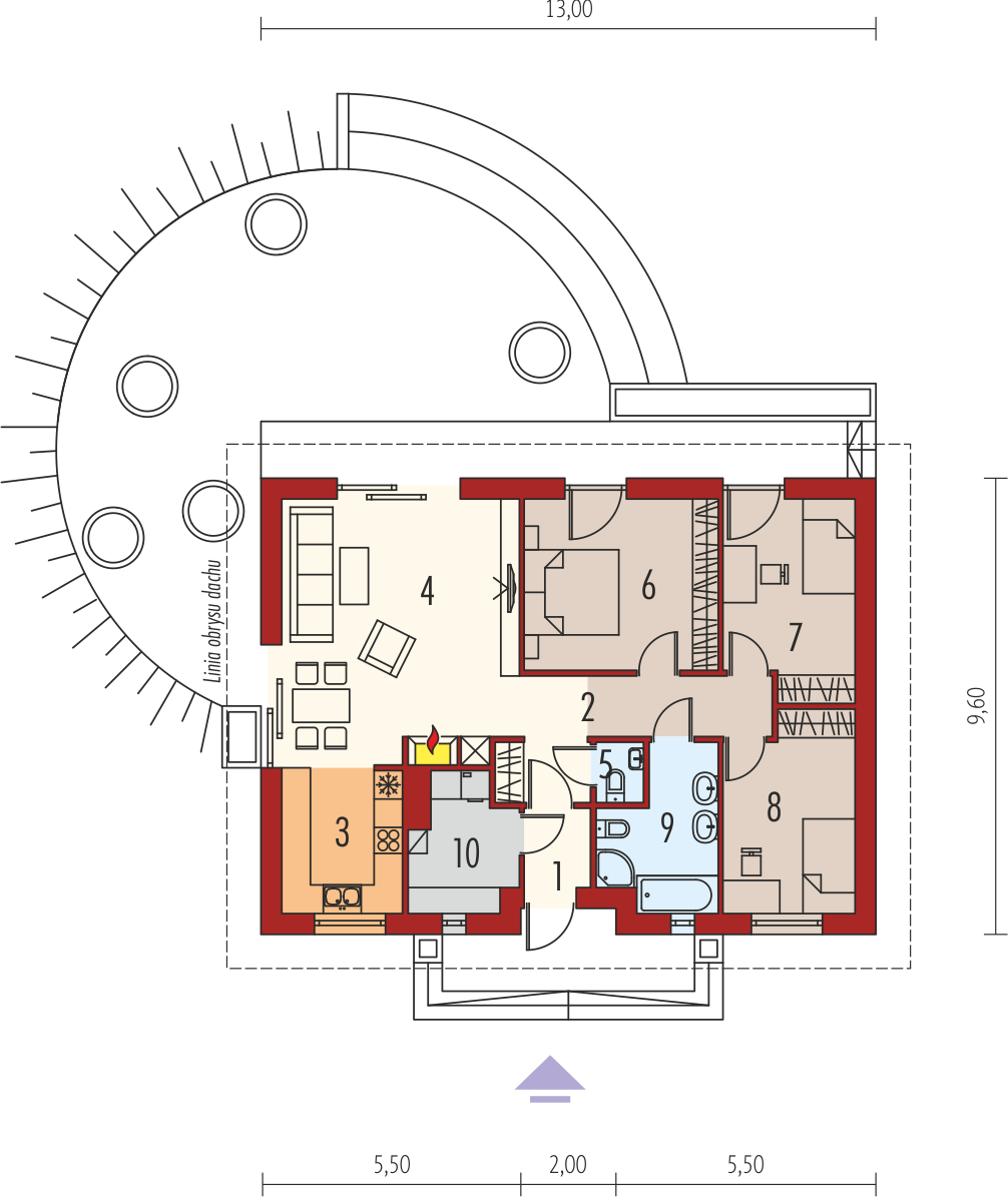 Graficzne opracowanie rzutów poglądowych widocznych na karcie projektu zostało wykonane przez Extradom.pl. Prezentowane przez Extradom.pl wizualizacje wykonane zostały przez autora projektu i należy poczytywać je jedynie za przykład i propozycję wykończenia, wizję architektoniczną autora projektu. Ostateczne wykończenie budynku może nastąpić na wiele sposobów. Szczegółowe rozwiązania zastosowane w oferowanej dokumentacji - w tym również ilość, lokalizacje i wygląd okien, drzwi, kominów - mogą w niewielkim stopniu różnić się od prezentowanej wizualizacji budynku.