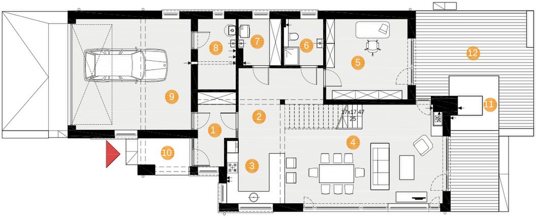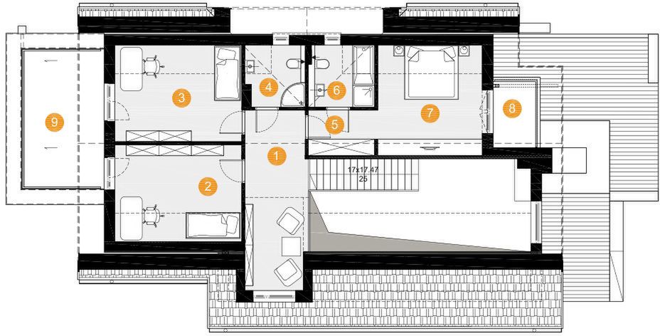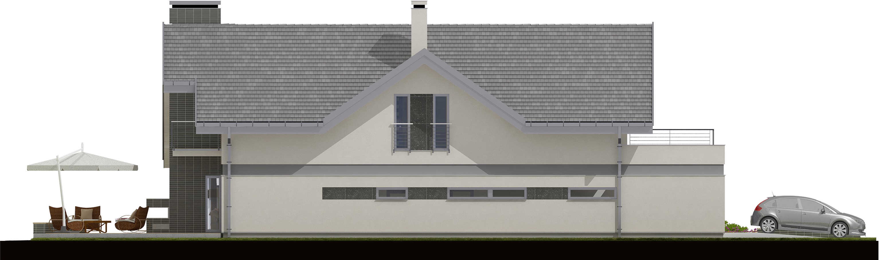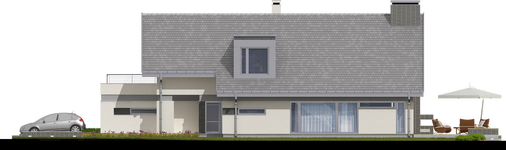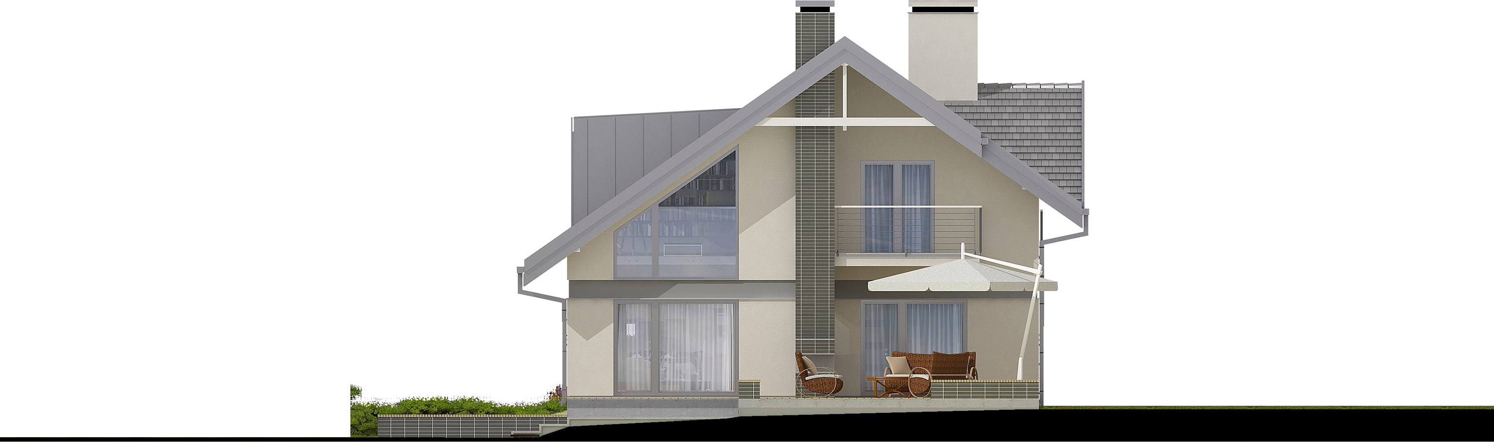 Graficzne opracowanie rzutów poglądowych widocznych na karcie projektu zostało wykonane przez Extradom.pl. Prezentowane przez Extradom.pl wizualizacje wykonane zostały przez autora projektu i należy poczytywać je jedynie za przykład i propozycję wykończenia, wizję architektoniczną autora projektu. Ostateczne wykończenie budynku może nastąpić na wiele sposobów. Szczegółowe rozwiązania zastosowane w oferowanej dokumentacji - w tym również ilość, lokalizacje i wygląd okien, drzwi, kominów - mogą w niewielkim stopniu różnić się od prezentowanej wizualizacji budynku.
